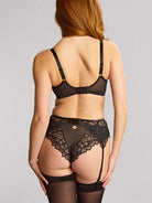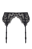 Complete your look with this coordinating suspender belt, crafted to match the season’s most luxurious lingerie set. This elegant piece features shimmering gold foiled lace that catches the light with every move, adding a radiant touch of glamour. Sparkling embellishments elevate the look, making it the perfect finishing touch for expressing your inner goddess.