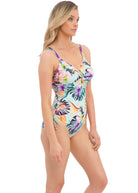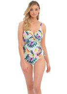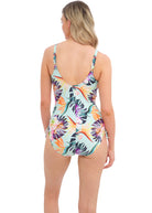 Fantasie's Paradiso Twist Front Swimsuit features concealed underwire for support and a figure flattering front twist detail. Adjustable tie sides offer variation of body length whilst also creating a ruching effect to flatter the tummy area, finished with a vibrant tropical print in Soft Mint.