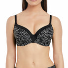Fantasie Swimwear Byron Bay moulded gathered bikini top. It is underwired, with padded cups and geometric print. The bikini top has adjustable straps and a snap clasp fastening at the back.