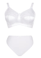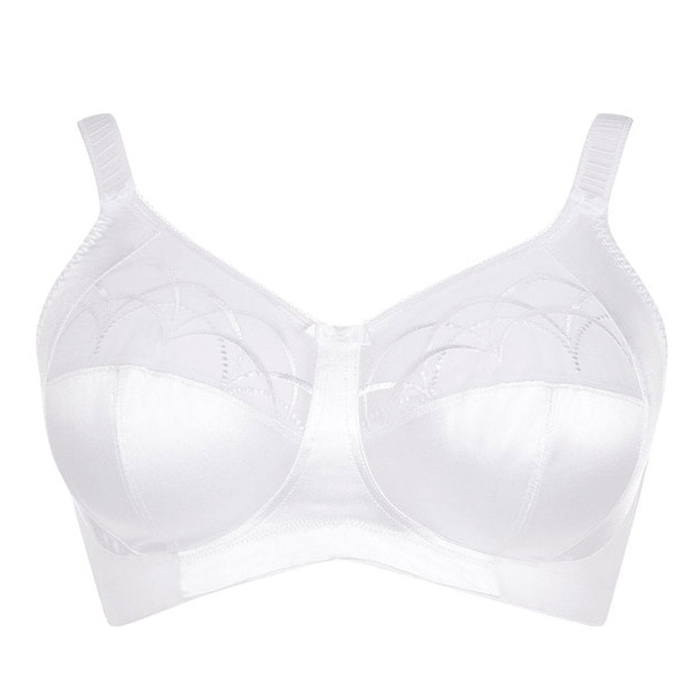 Enjoy the look and feel of the Cate Soft Cup Bra in a chic White colourway, showcasing sheer embroidery and soft satin for a luxurious look. Cate features a secure elastic underband and flexible side boning for anchorage and support, while three piece cups plus side support provide perfect forward shaping, up lift and separation.