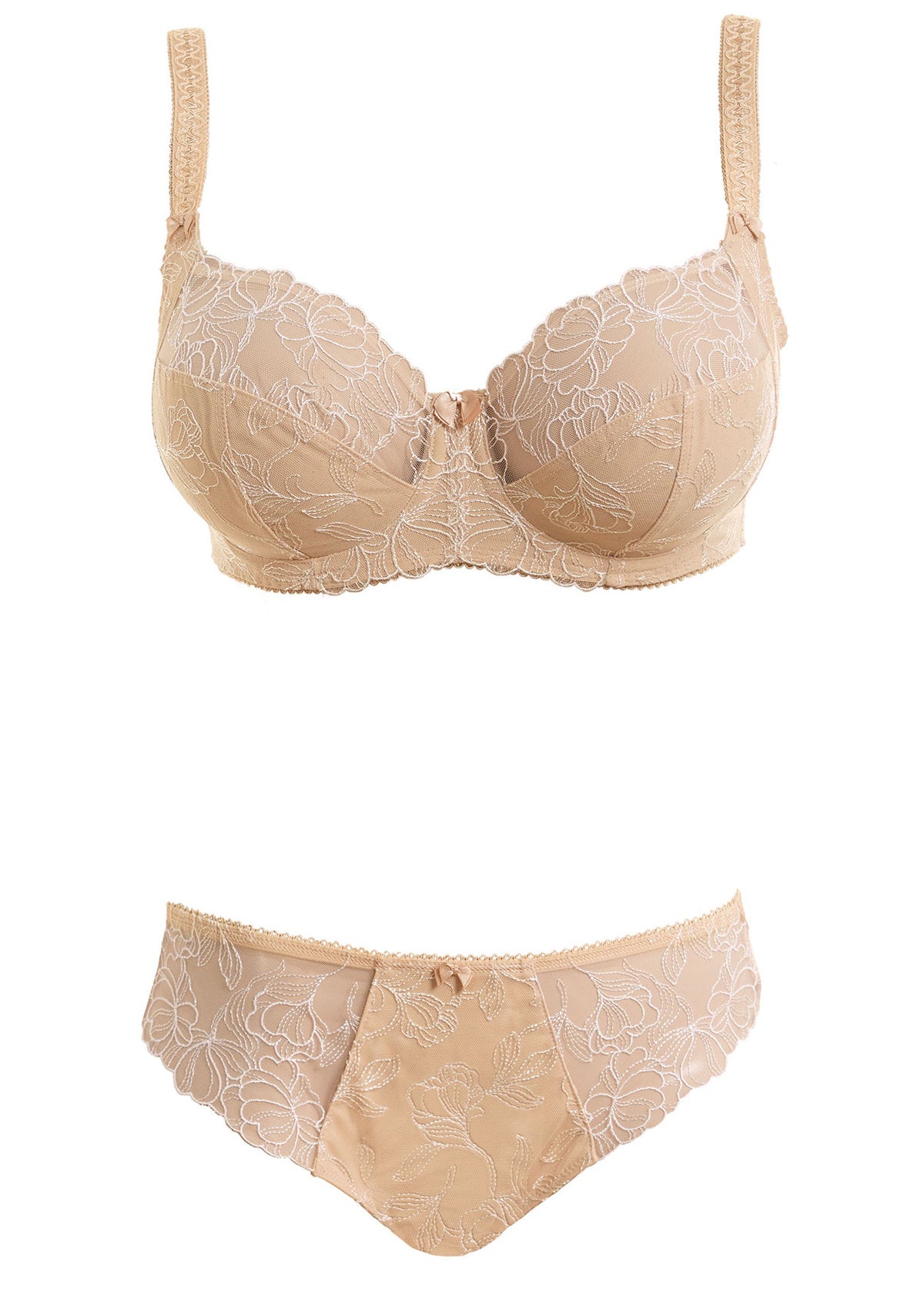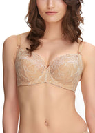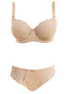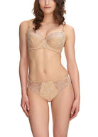 Uncover Estelle in Sand, boasting exclusive Austrian designed embroidery with a stylised, elegant floral pattern. The Side Support Bra features a three piece cup with side support for great uplift and projection.