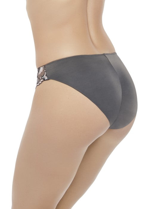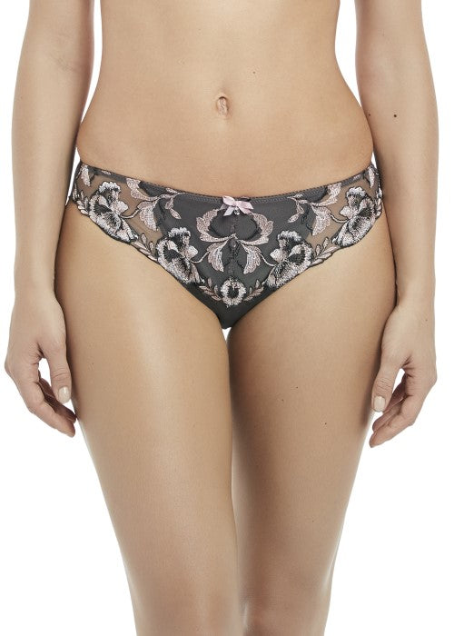 Angelina is a fascinating high-end as well as romantic lingerie collection. Exclusively designed for the famous brand Fantasie, the Swiss embroideries representing luxurious flowers are set on a magnificent dark grey airy tulle. The finishing touches of the series include two-coloured little bows, a fancy rhinestone and picot borders highlighting the contours of these fine undergarment.
