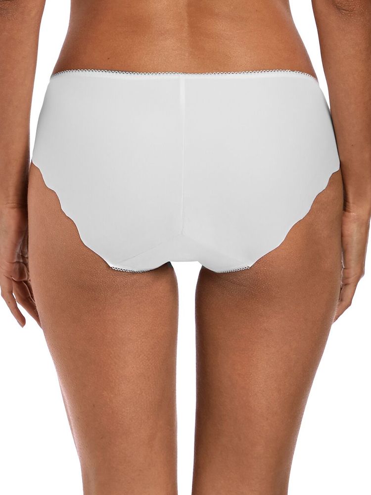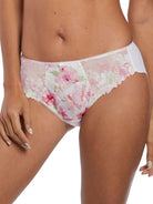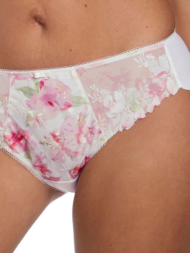 Fantasie Annalise a beautiful and indulgent lingerie collection featuring intricate floral embroidery in contrasting colours for a captivating look. With the soft stretch element this brief is super comfortable as it sits snug in all the right places. The lace panels on either sides aim to give you a slimmer silhouette with the watercolour floral print panel in the middle. The mid rise brief provides good overall coverage with a lined gusset for added comfort. Complete with mini loop edge elastic around the waistband and a small satin bow.