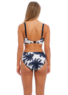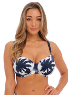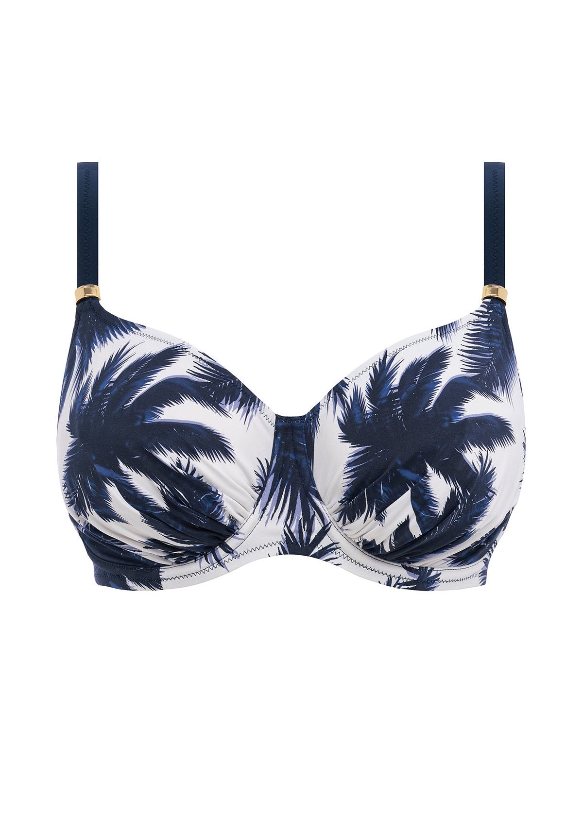 Make a splash with Fantasie's Carmelita Avenue Full Cup Bikini Top. Gathered cups flatter every shape while full coverage ensures support and a forward profile. Adorned in a print inspired by the palm trees of Beverly Hills in a French Navy colourway against a crisp white backdrop.