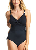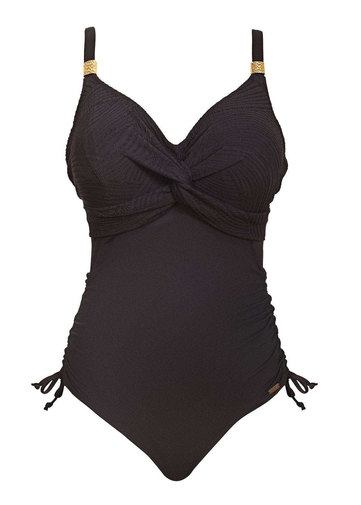Lounge by the poolside in the Ottawa Twist Front Swimsuit in Black, cut from a premium Italian fabric that feels exquisite against the skin. This elegant swimwear style features a twist front detail and adjustable tie sides that create a flattering ruching effect around the tummy area. Complete with a contemporary scoop back and fixed fully adjustable straps. Available in cup sizes D - GG.