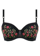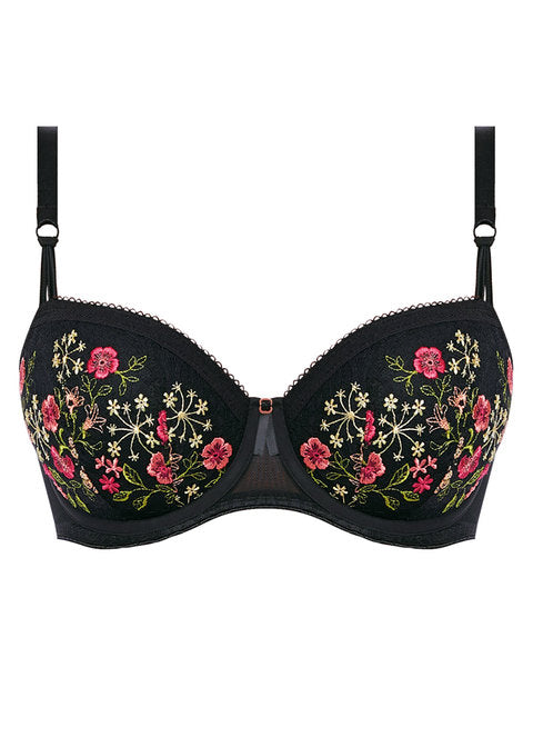 This feminine half cup bra combines padding and underwiring for comfort and support, complemented by beautiful floral embroidery. It features adjustable straps and fastens securely at the back with a hook and eye closure.