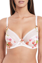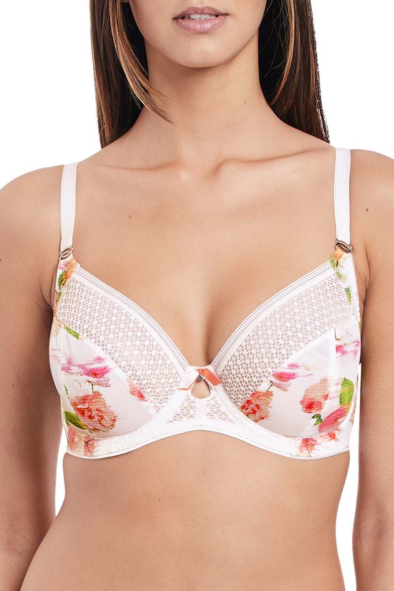 This non padded side support bra features a floral design that rests on a crisp white base. A modern geometric net for a clean and fresh look a super soft handle fabric for a comfortable feel with a semi sheer top cup for a beautifully feminine look.