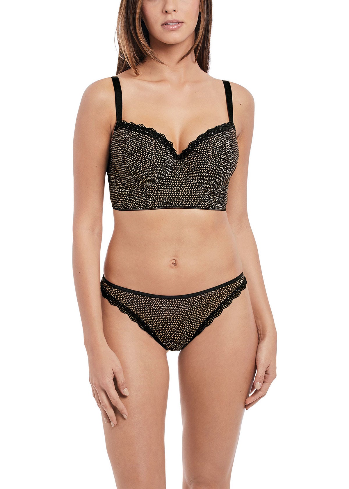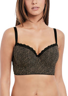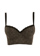 Discover the fashion-forward Summer Haze Longline Bra style, featuring soft foam padded cups in sizes C - H for definition, shape and uplift. The pretty style is designed in an essential Black colourway with lace trim detailing and mocha spots.
