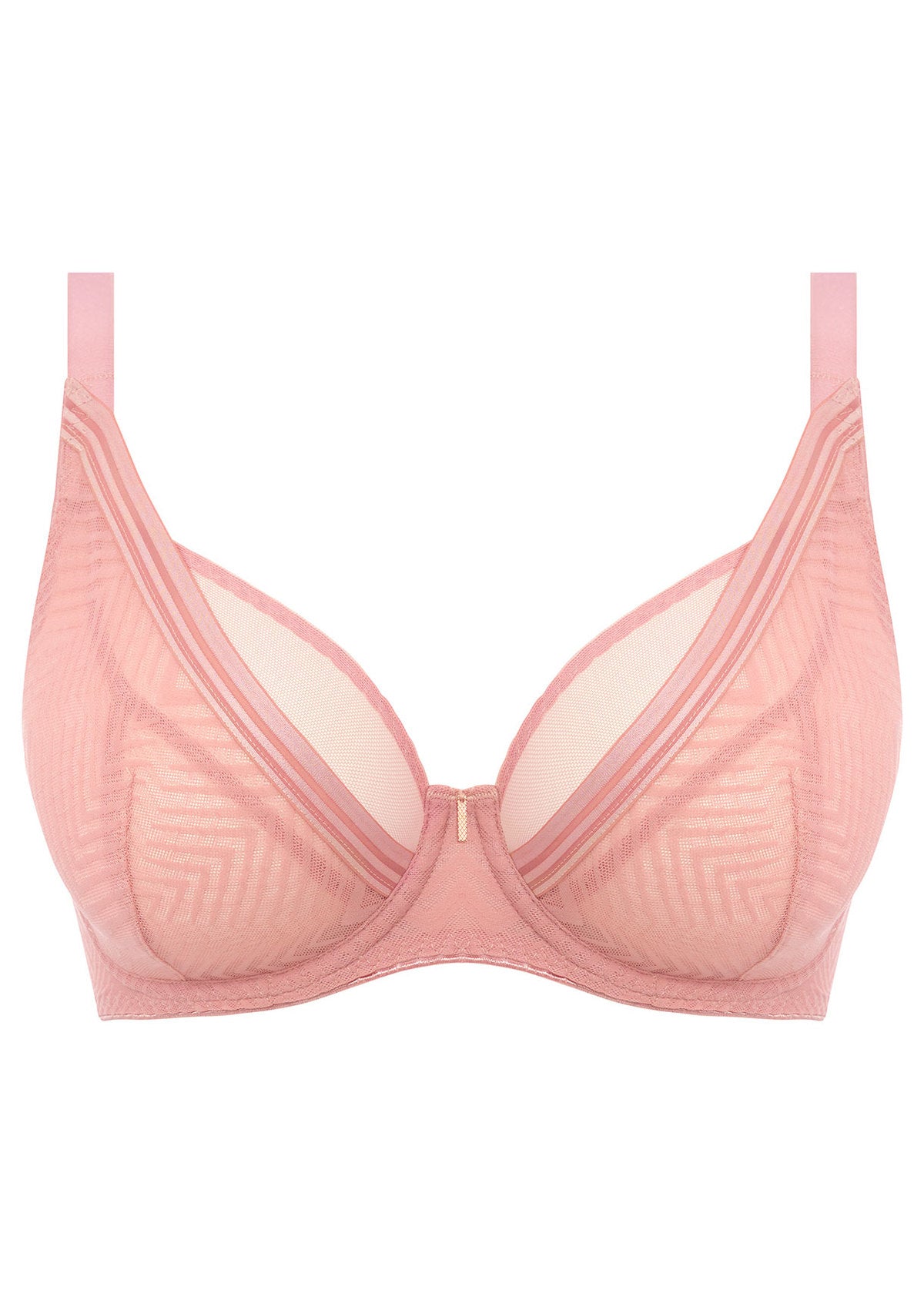 Flattering low centre front Plunge frame is made from a rigid semi-sheer net for a lighter look without loss of support Stretch geo-lace outer cup to create high apex and give forward projection Stretch outer cup features a flat shadow striped elastic along the neck edge Fixed fully adjustable straps to prevent strap slippage Rose gold bar trim at centre front