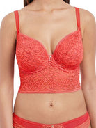 Discover Freya's much-loved Soiree Lace Bralette, a fashion-forward style crafted with stretch geometric Coral lace on both the body and cups. A plunging neckline and underwires offer perfect shape, support and uplift without push up in cup sizes C to G.