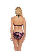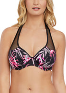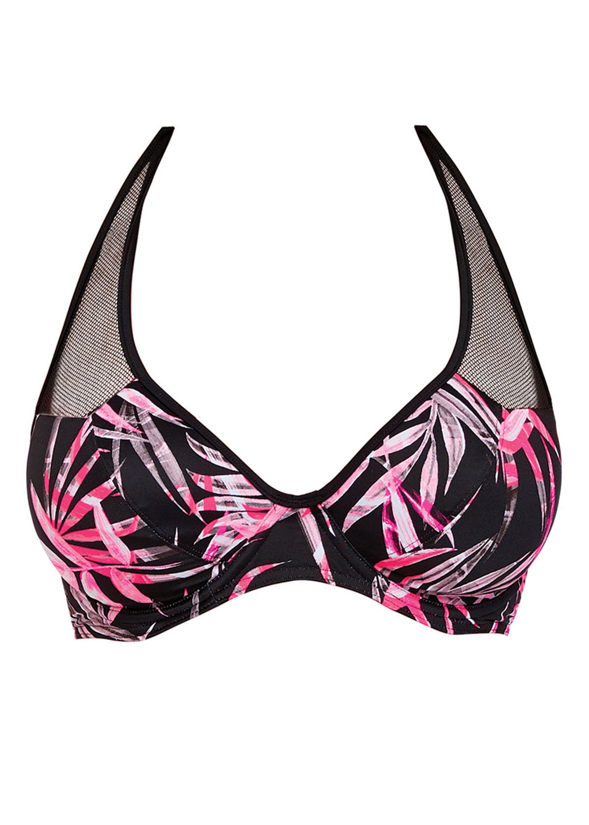 Freya's Sunset Palm Halter Bikini Top mixes a hot pink palm print with black mesh details for a tropical on-trend design. The low plunging neckline offers less coverage, while lined cups create perfect shape and support.
