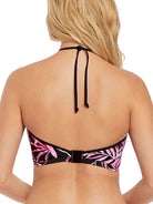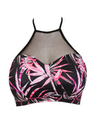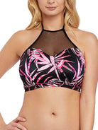 Introducing the Sunset Palm hi-neck crop bikini top by Freya, designed to flatter any body shape. It features lightly padded foam cups for support and comfort, along with underwire for natural uplift. The vibrant palm leaf print runs throughout the top, adding vibrancy and fun. For those seeking more coverage, sheer mesh covers the upper chest area, making it ideal for those with a fuller bust. The bikini top also includes a self-tie halterneck fastening for adjustable comfort.