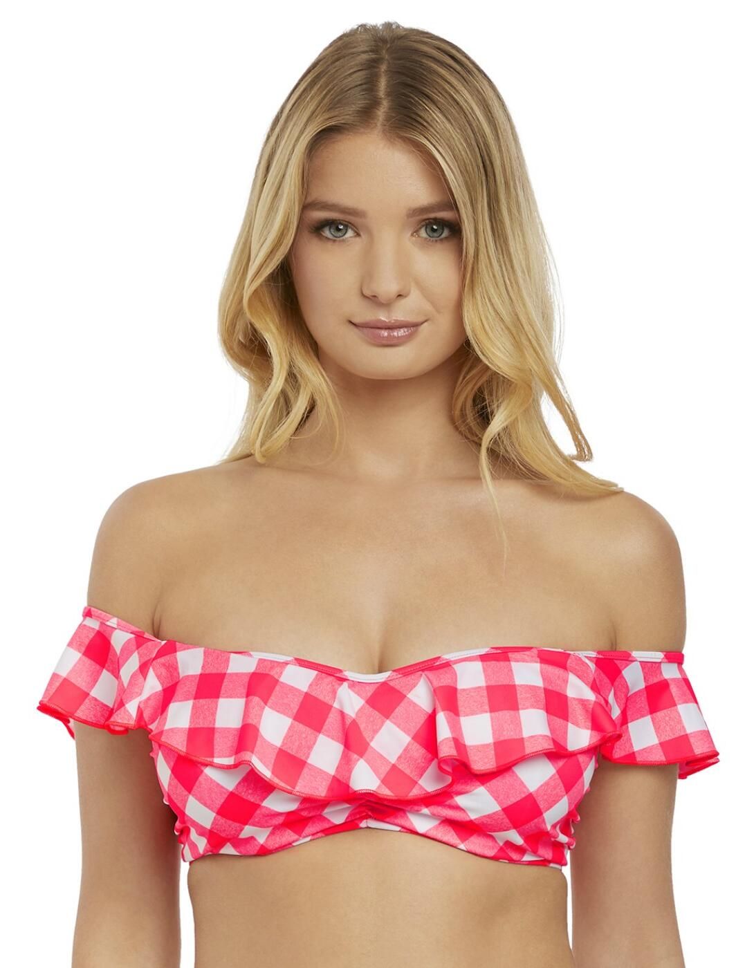 Discover Freya's Totally Check Bardot Bikini Top. The stunning retro style showcases an off the shoulder cap sleeve and a waterfall trim in an oversized Tropical Punch gingham print. Lightly padded foam cups create rounded shape and support in cup sizes C- G.