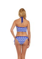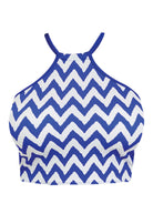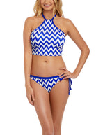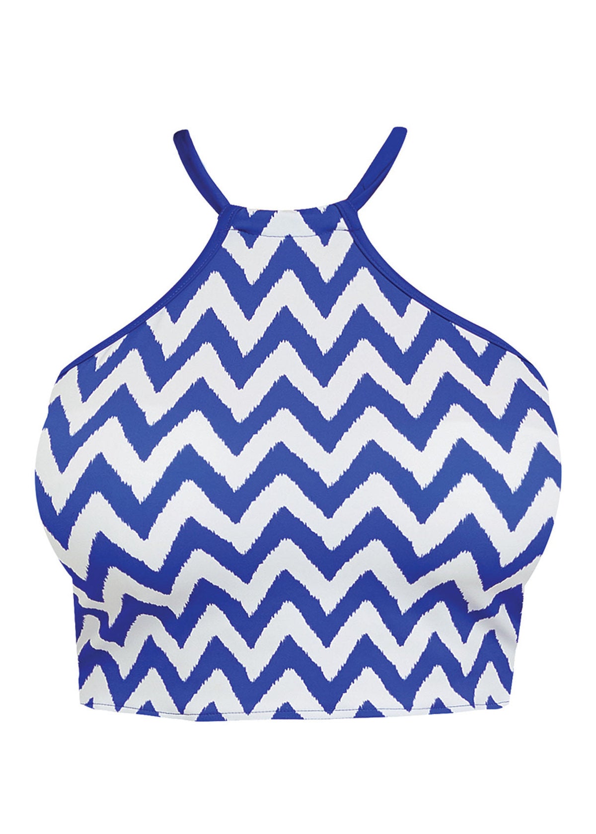 Discover the unique style of the Making Waves Croptini Top, offering a statement look with a bold zig-zag print in Cobalt blue. The longline style features a contemporary high neck design with lightly padded foam cups