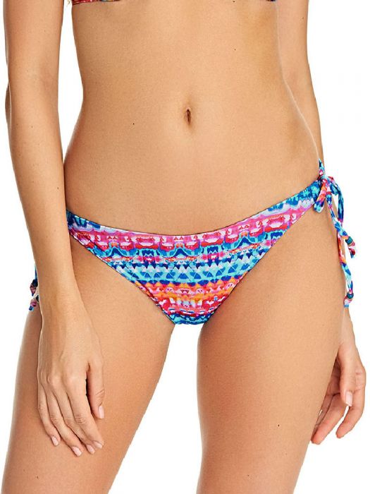 The Freya Cuban Crush swimwear collection, with its enchanting Aztec-inspired watercolour print, features a vibrant mix of warm corals, hot pinks, and cool blues for a striking appearance in the sunshine. The mid-rise bikini briefs come with adjustable tie-sides, providing a sultry look by the pool while offering medium coverage. the rear.