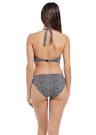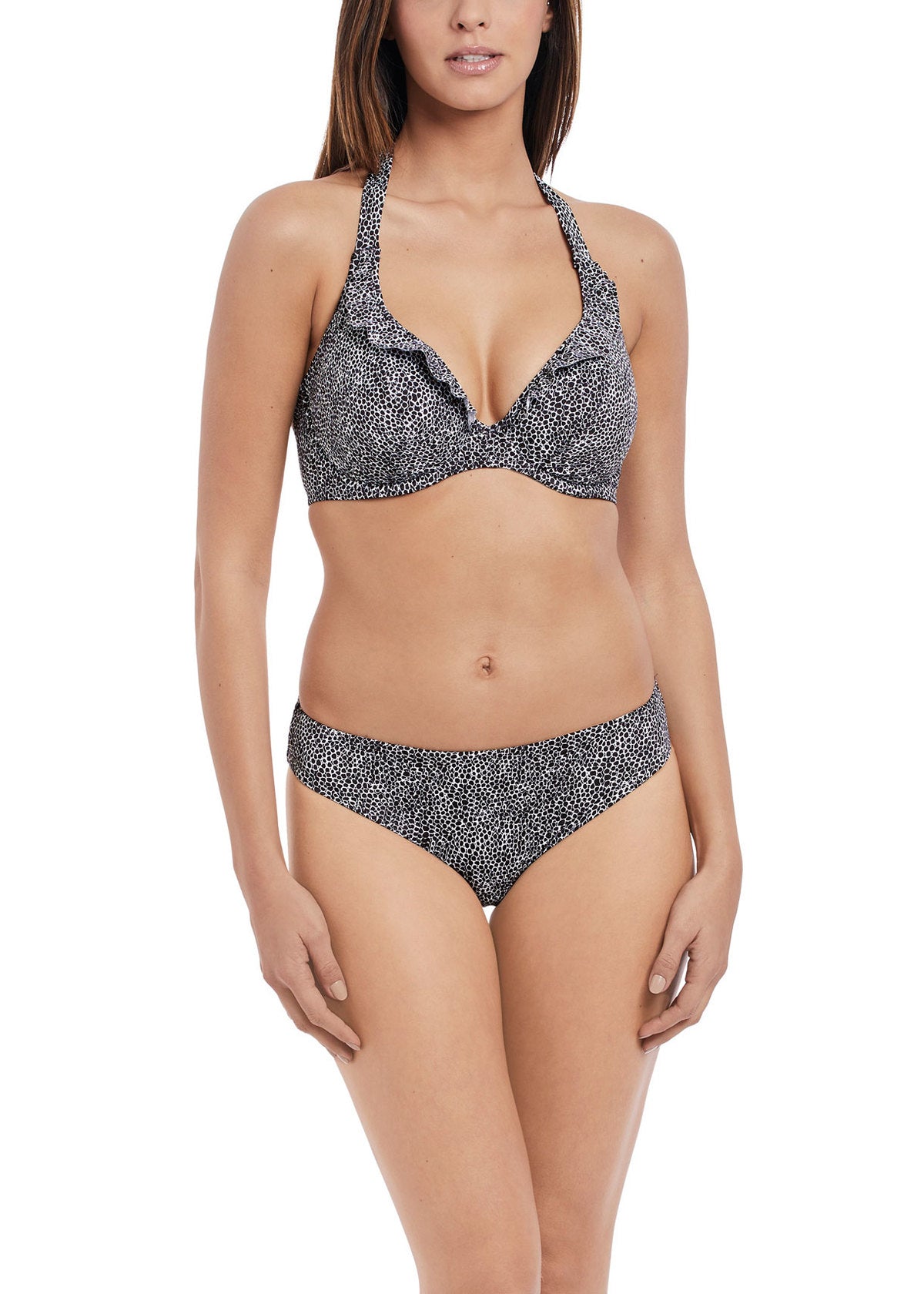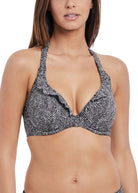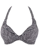 Be ready for the waves in the Run Wild Banded Halter Bikini Top, showcasing a monochrome animal print and a fun waterfall frill detail for a full on island life feel. Designed with a low plunging neckline for less coverage, lined cups provide perfect shape and support, complete with fixed halter neck ties.