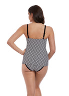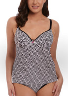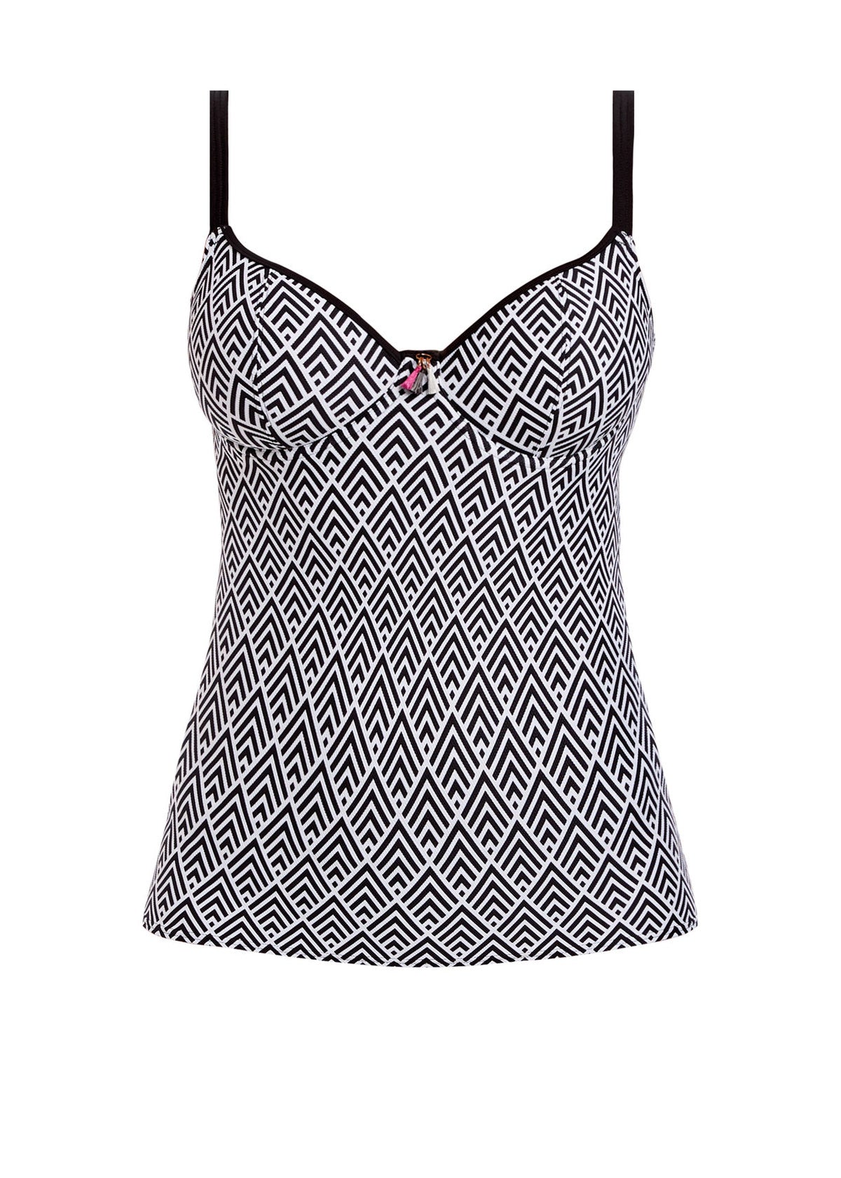 Monochrome design with striking geometric shapes and contrast black bindings. Lined cups offer superb shape and support without padding, while a straight back offers an outerwear look.