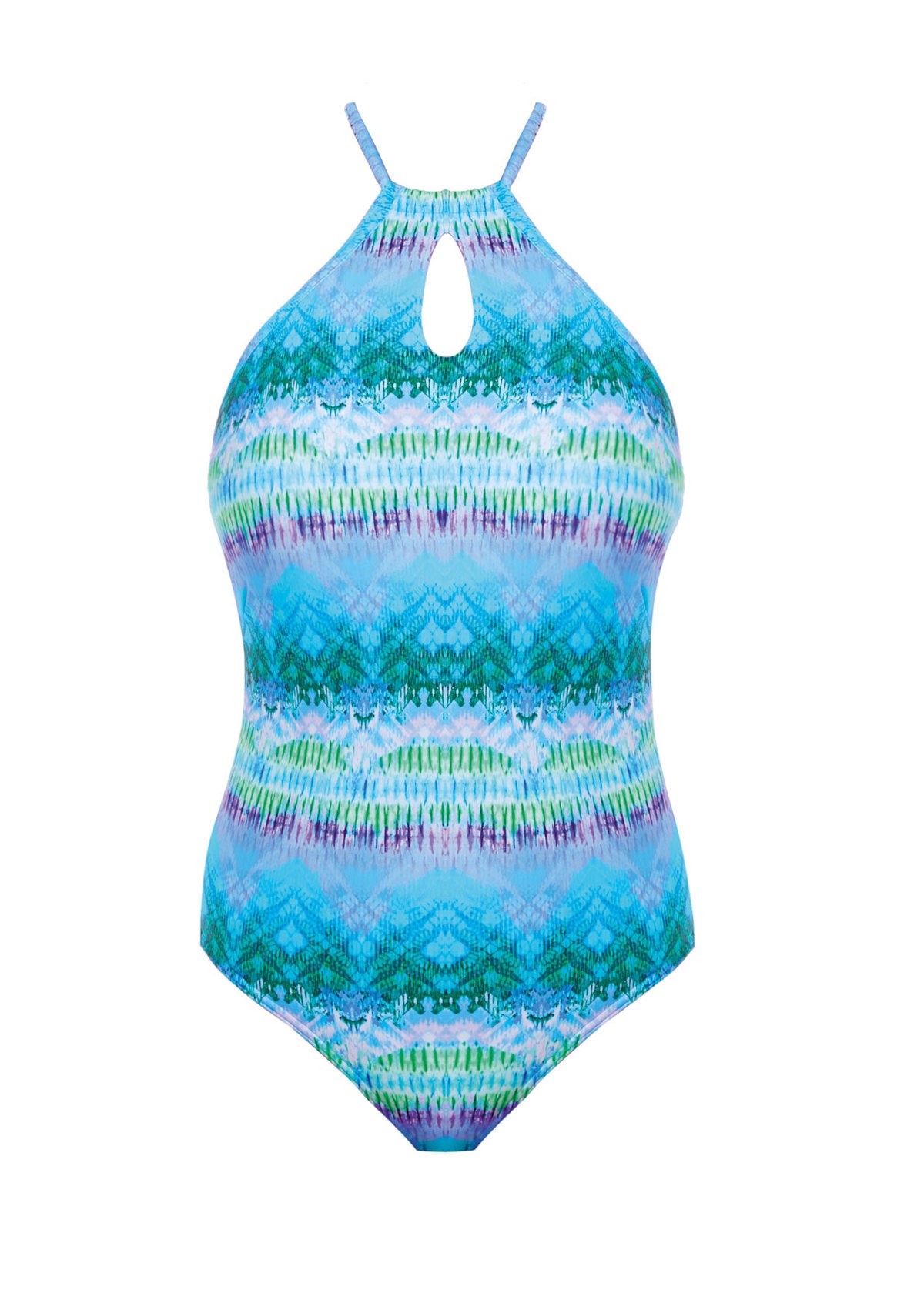 Discover the contemporary styling of Seascape's High Neck Swimsuit in an oceanic Blue Lagoon ombre print. The high neck style features concealed underwires and lightly padded foam cups to provide rounded shaping and support to ensure you feel at your best, finished with skinny halter neck straps. Available in cup sizes C - FF.