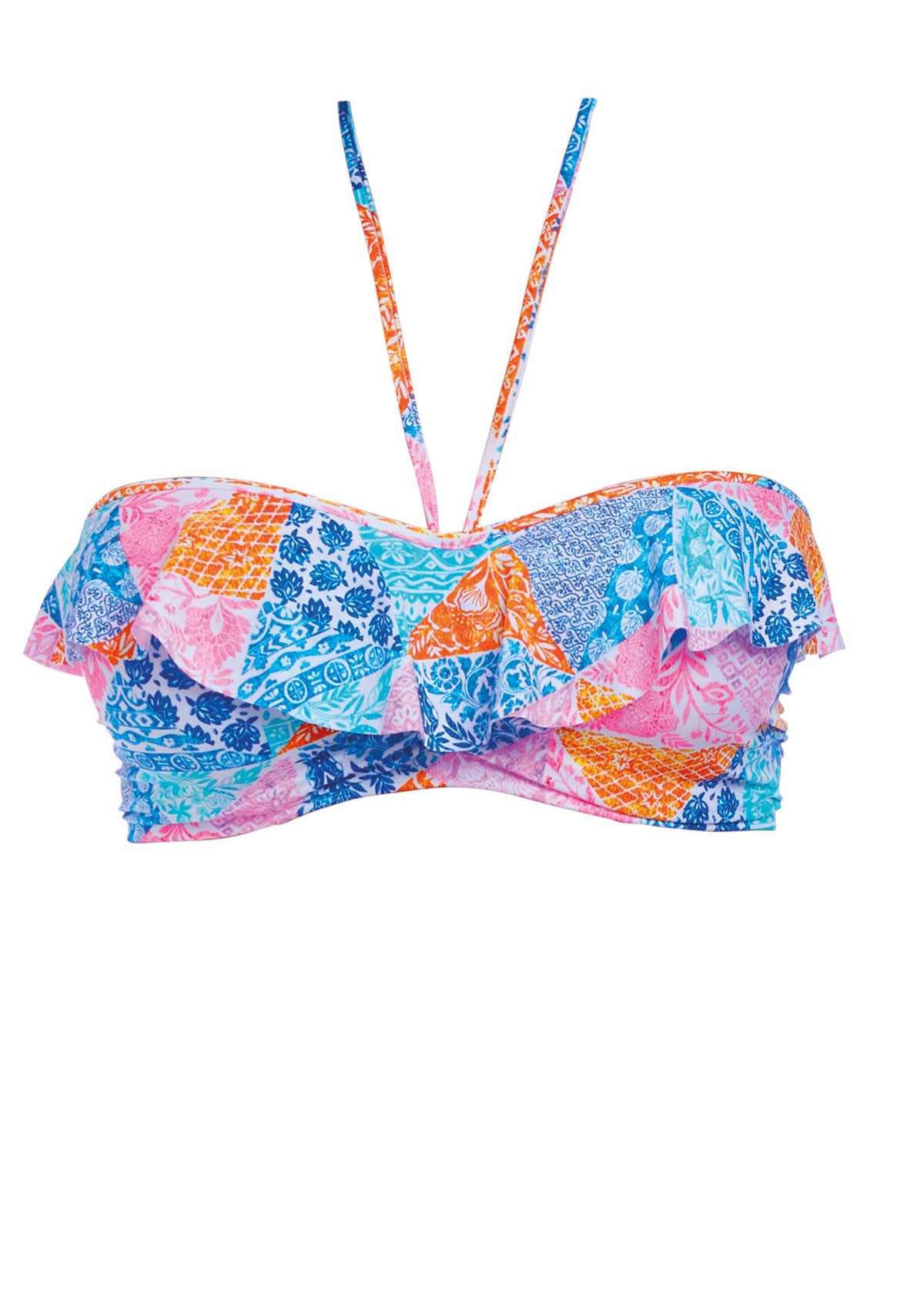 The Festival Girl Padded Bandeau Bikini Top features a striking paisley print in pops of pink, orange and blue. The must-have style is designed with a flattering waterfall frill and lightly padded foam cups that offer a rounded shape and support