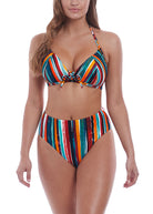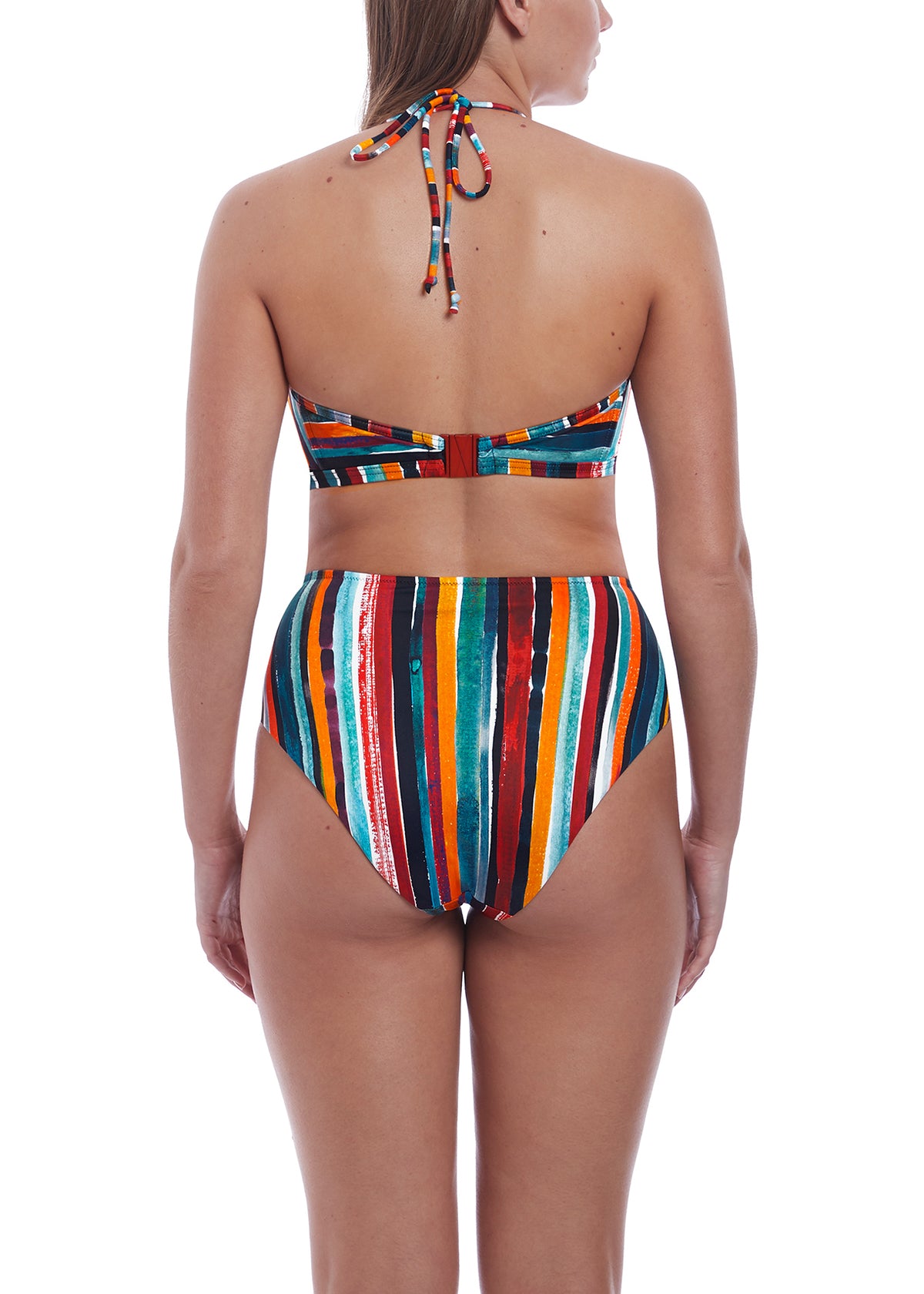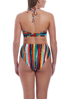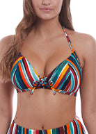 Enjoy every moment of your holiday in the Bali Bay Soft Triangle Bikini Top, making a statement with a stripe print in seasonal colours. The vibrant style is designed with lightly padded cups and halter neck ties for great shape and support complete with a criss-cross tie detail for a fashion-forward look.