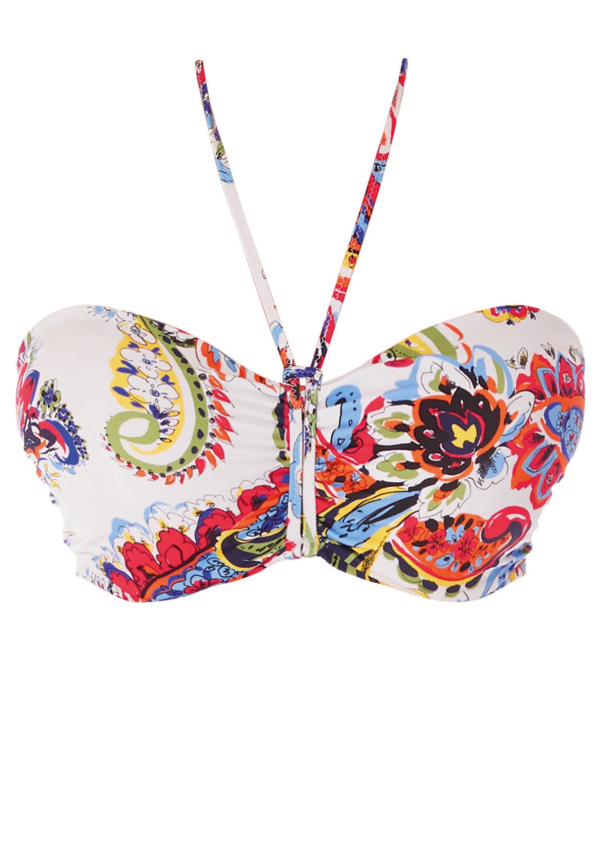 The ocean is calling with Freya's Rococo Padded Bandeau Bikini Top, showcasing a baroque-inspired Paisley print in stand-out shades of blues, reds and yellows. The striking style features lightly padded foam cups for rounded shape and support, complete with a flattering gathered detail at the front with skinny halter neck ties. Available in cup sizes C - G.