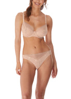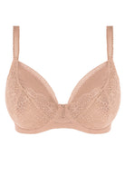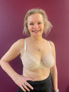 Feel transformed in the luxurious Expression Plunge Bra, showcasing statement crochet look lace and decorative trims in a timeless Natural Beige colourway. The low centre front creates a revealing neckline, while stretch mesh top cups offer ease of fit and a rounder shape in cup sizes D-H.