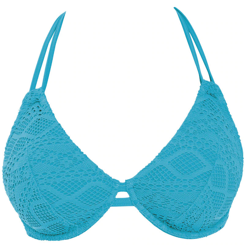 Discover an essential swim style with the Sundance Bandless Halter Bikini Top, featuring a stylish crochet design in a timeless Deep Ocean colourway. Lined cups offer shape and support, alongside a plunging neckline for less coverage, complete with fixed skinny halter neck ties.