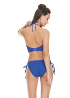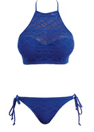 Discover a perfect holiday essential with the Sundance High Neck Crop Bikini Top in a cool Cobalt Blue, featuring a concealed underwire and lightly padded foam cups for excellent support and comfort in cup sizes D-G. The high neck bikini top styling features a sheer crochet overlay with fixed halter neck ties for a secure fit.