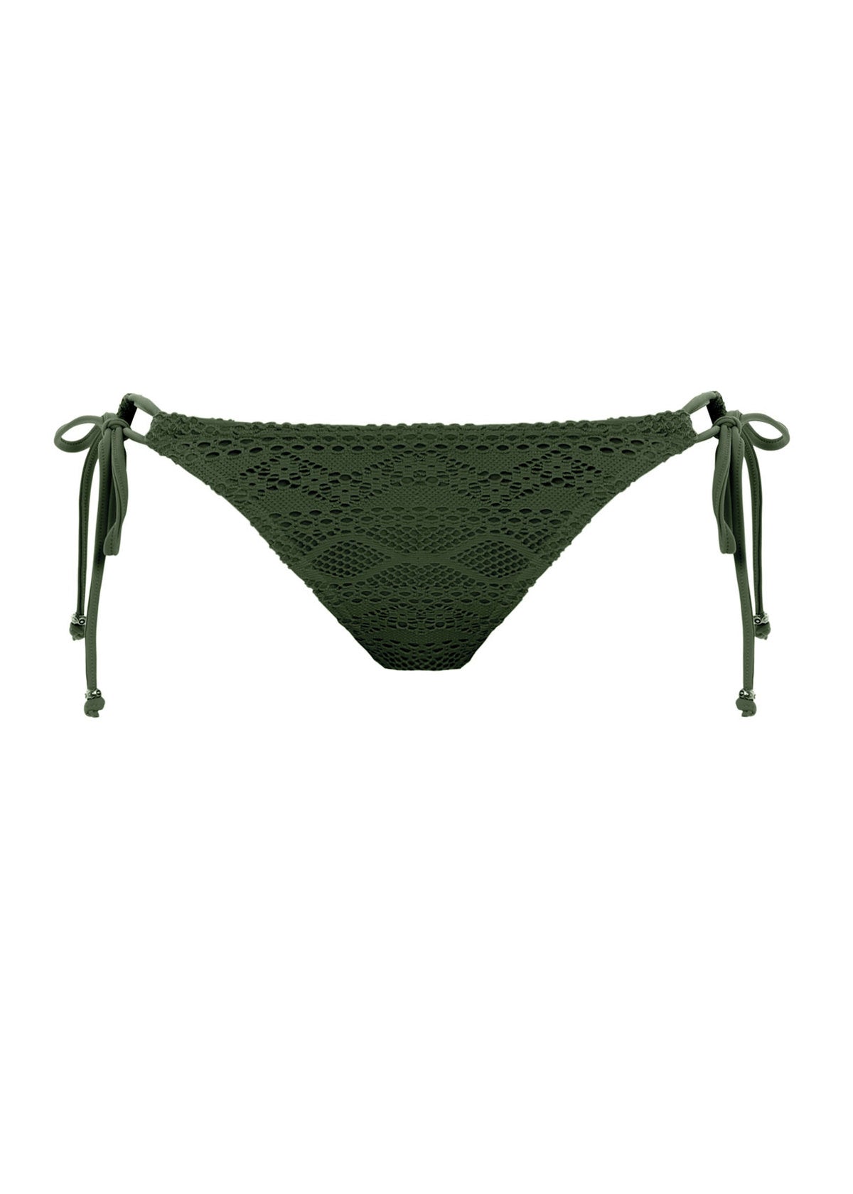 Freya's Sundance Tie Side Bikini Brief in Fern is a green crochet-look co-ordinate that sits low on the hips with narrow adjustable sides and an all over medium bottom coverage. Available in sizes XS - XL.