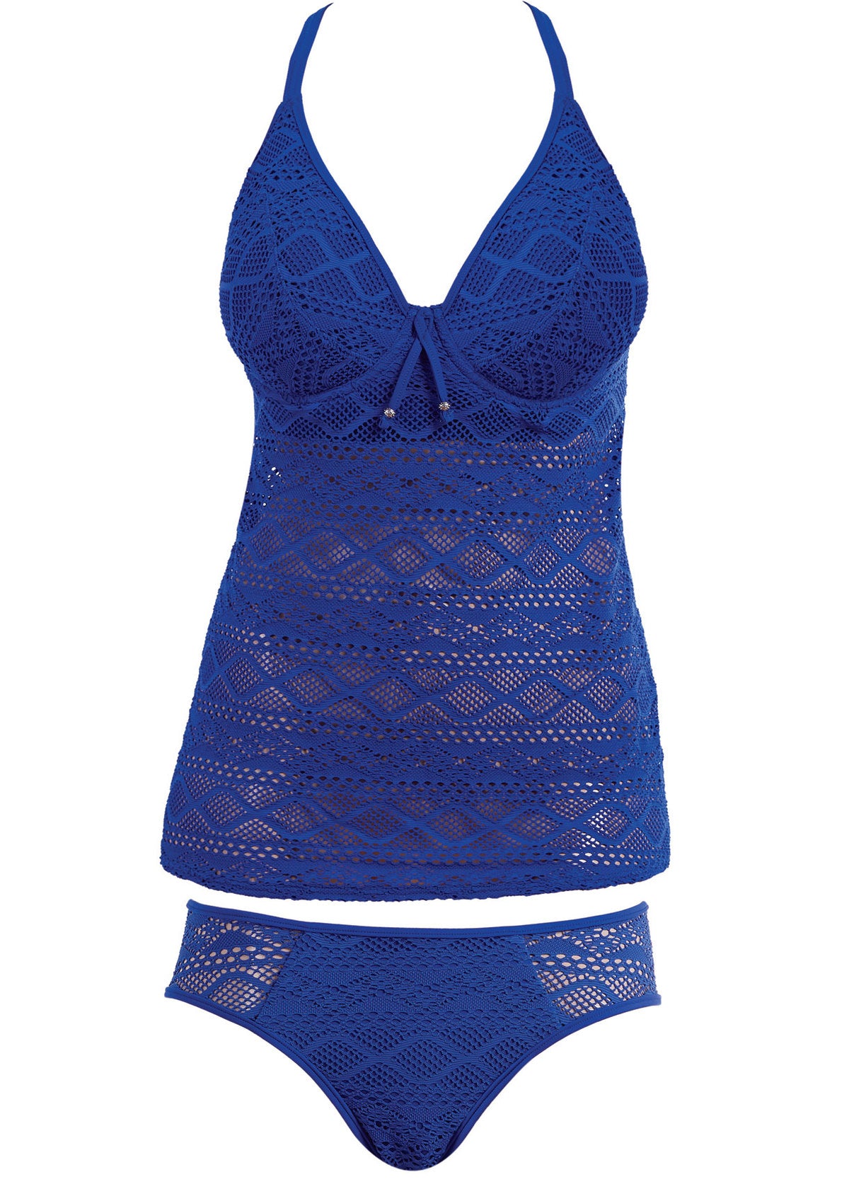 The Sundance Tankini Top combines crochet with striking geometric shapes in Cobalt. Lightly padded foam cups alongside a plunging neckline provide rounded shape, support and a flattering look while convertible adjustable straps can be worn as a halter, over the shoulder or cross back style in cup sizes D-GG.