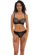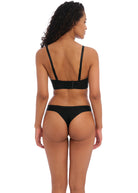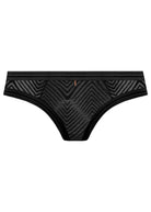 Complete the collection with the Tailored Brazilian in Black, a stretch geo-lace front style featuring light lining in front for modesty and a fold over finish at the back for no VPL. Delicately finished with a rose gold bar trim at the centre front, available in sizes XS - XL.