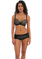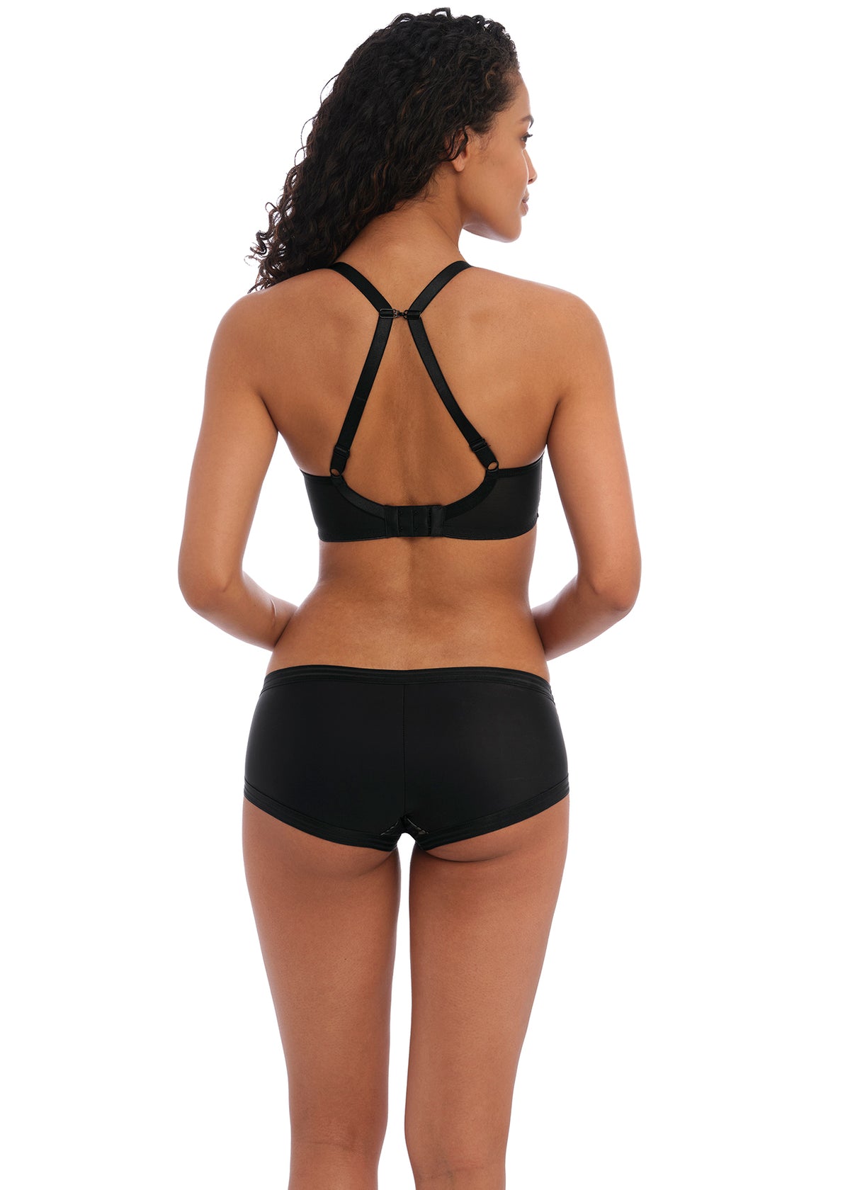 A geometric mesh lace overlay steals the show in our Tailored Short in Black, a stretch geo-lace front design that features light lining in front for modesty and flat shadow striped elastic at the waist and legs. Completed with a rose gold bar trim at the centre front, available in sizes XS - XL.