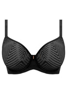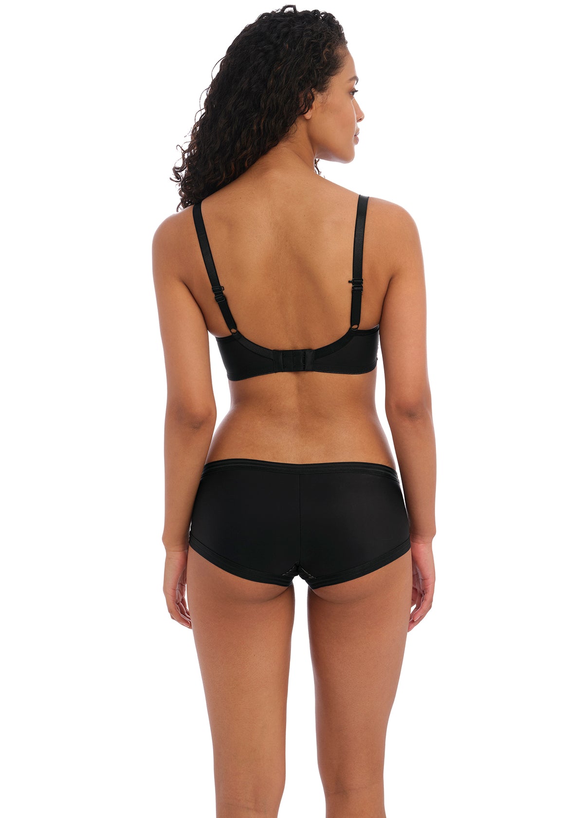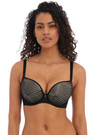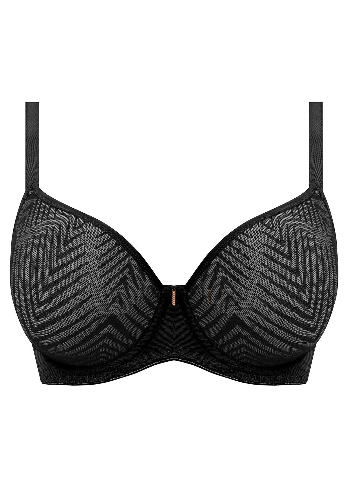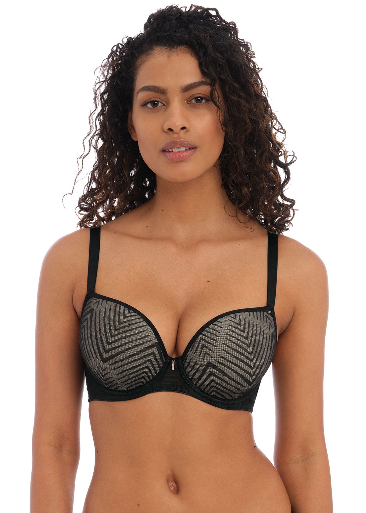 Contemporary styling meets lingerie essentials in our Tailored Moulded Plunge Bra in Black. Moulded cups create a smooth rounded silhouette whilst a low centre front offers the desired cleavage without overspill. Complete with a stretch geo-lace over lay fora no show finish under clothing and a rose gold bar trim at the centre front.