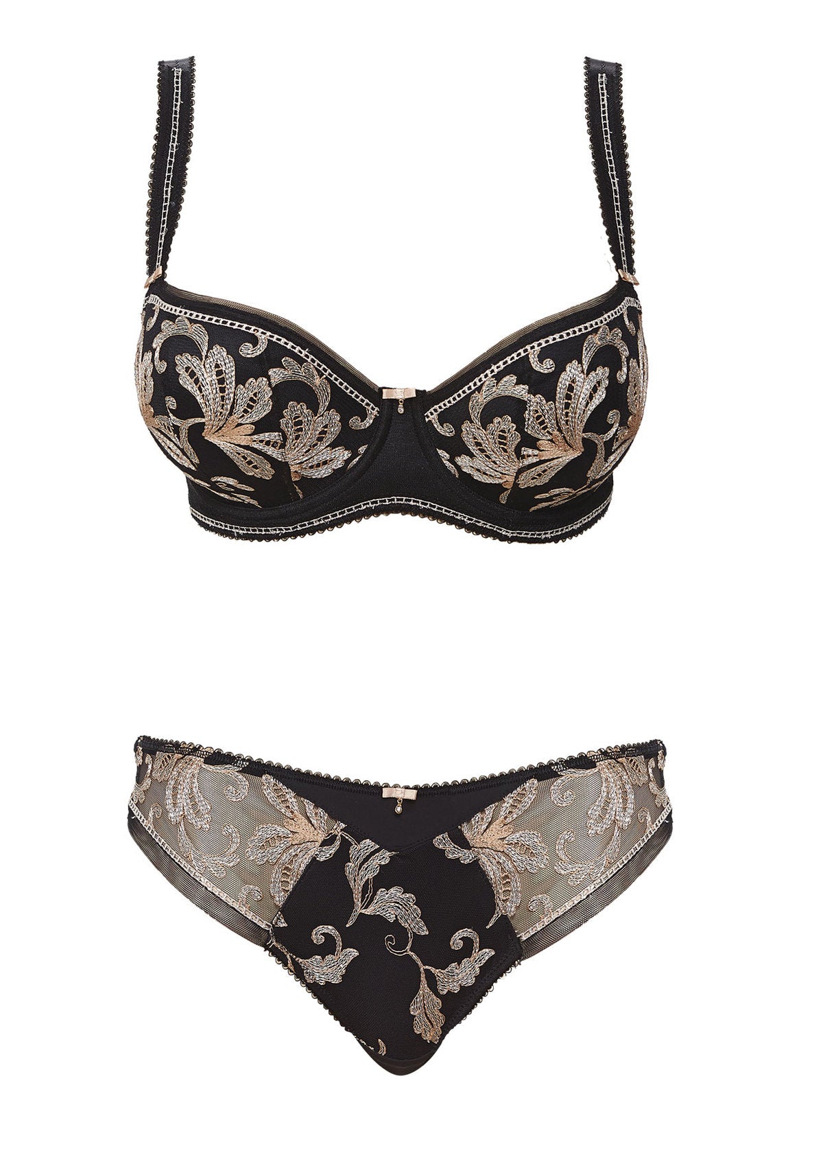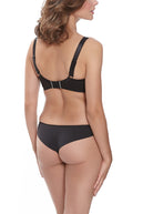 Uncover Fantasie's Sofia Padded Half Cup Bra in Black, showcasing opulent Swiss embroidery in gold tones. Lightly padded cups offer great support for a smooth rounded shape, while a three section cup provides great uplift.