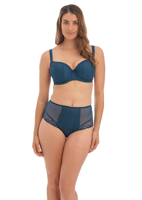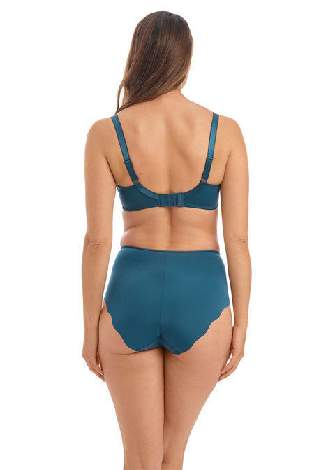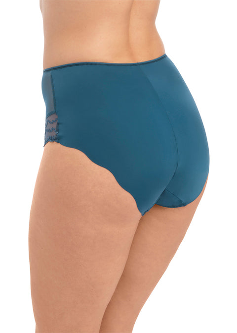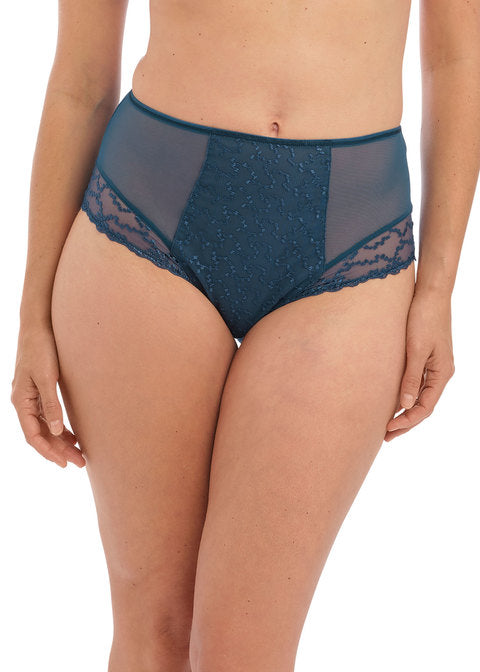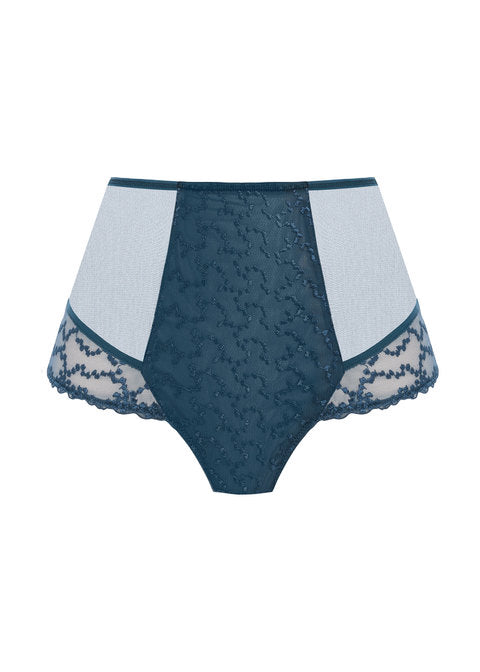 Discover Fantasie's effortless Ana collection. The High Waist Brief offers light control and smoothing, while Swiss-designed embroidery trails across the beautifully soft Teal coloured fabric.