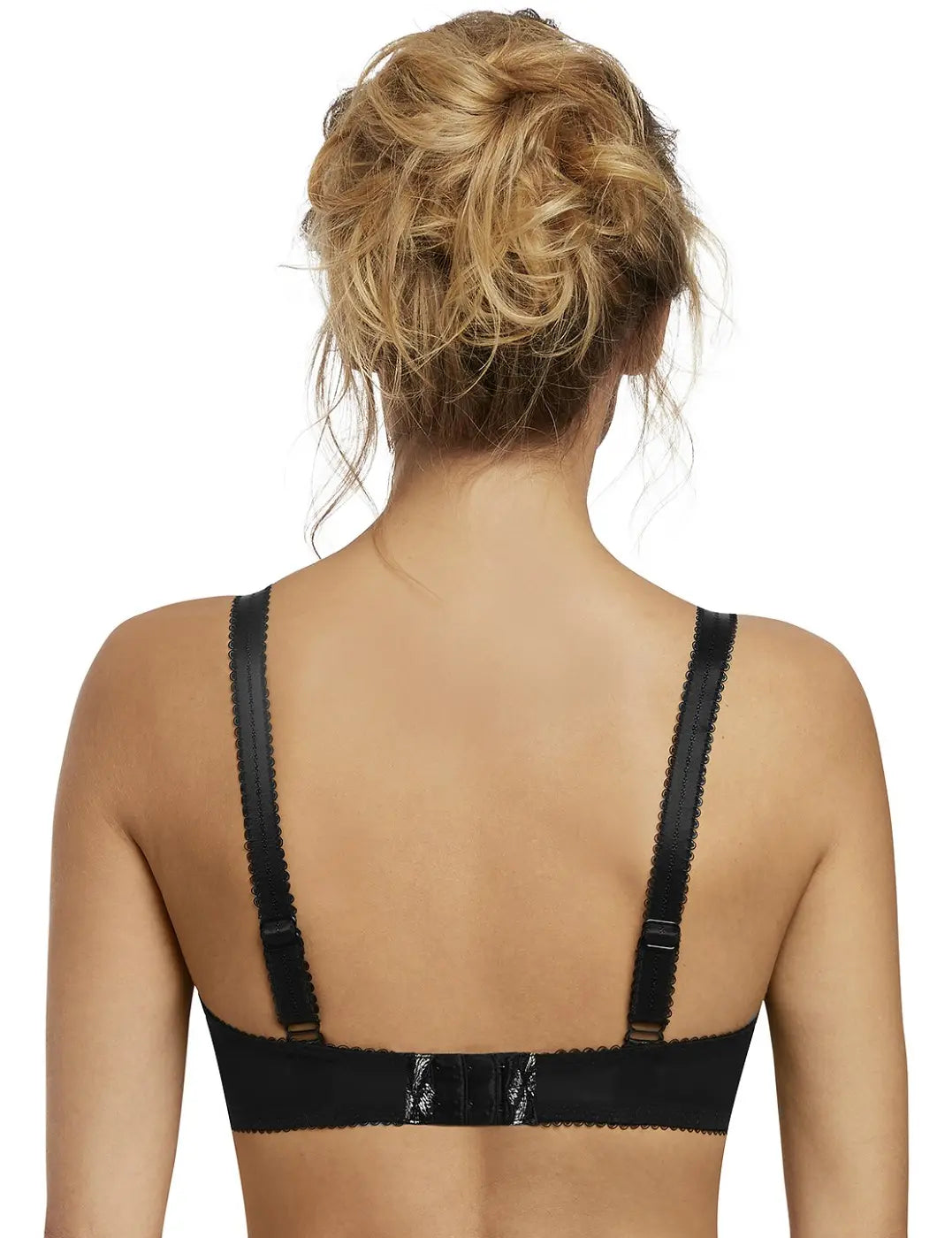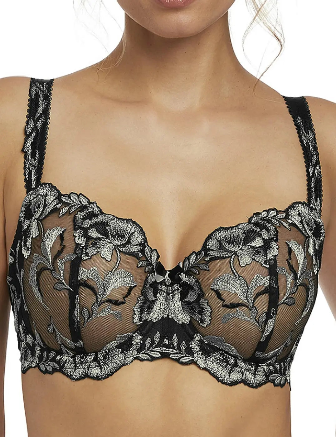The Fantasie Angelina Side Support Bra in Platinum is not afraid to show her dramatic side. The collection is captivatingly adorned with three-tone bows and diamante trim. The Swiss floral embroidery is designed exclusively for Fantasie.