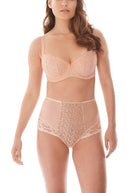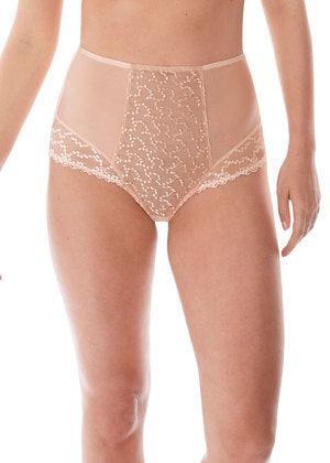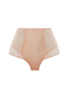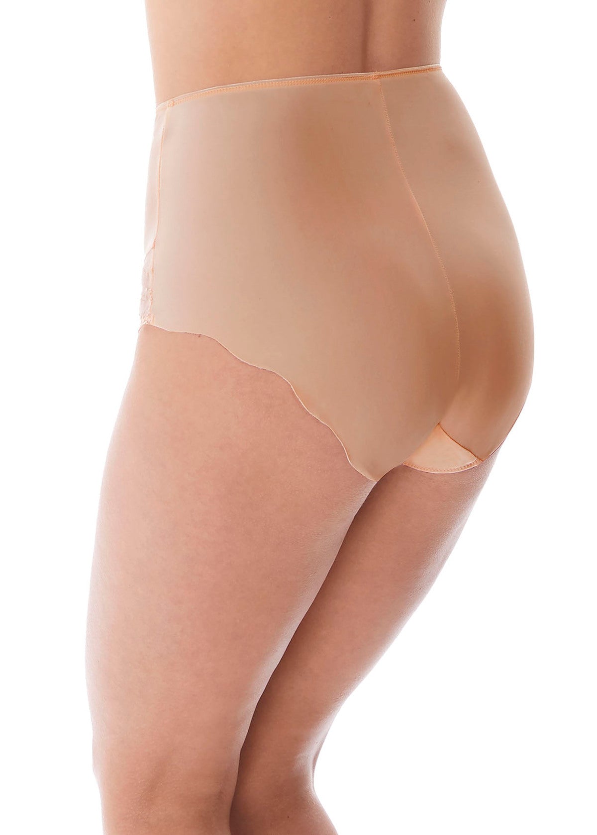 Uncover Fantasie's Ana High Waist Brief in a natural Blush hue, showcasing an embroidered front panel with light control lining for a smoothing effect. Crafted from a comfortable, soft fabric with scallop edges for minimal visibility under clothing.