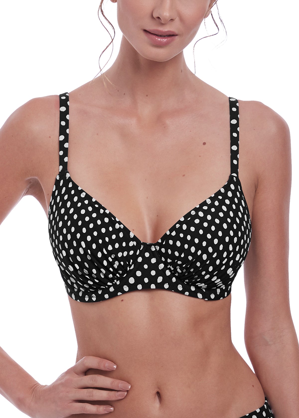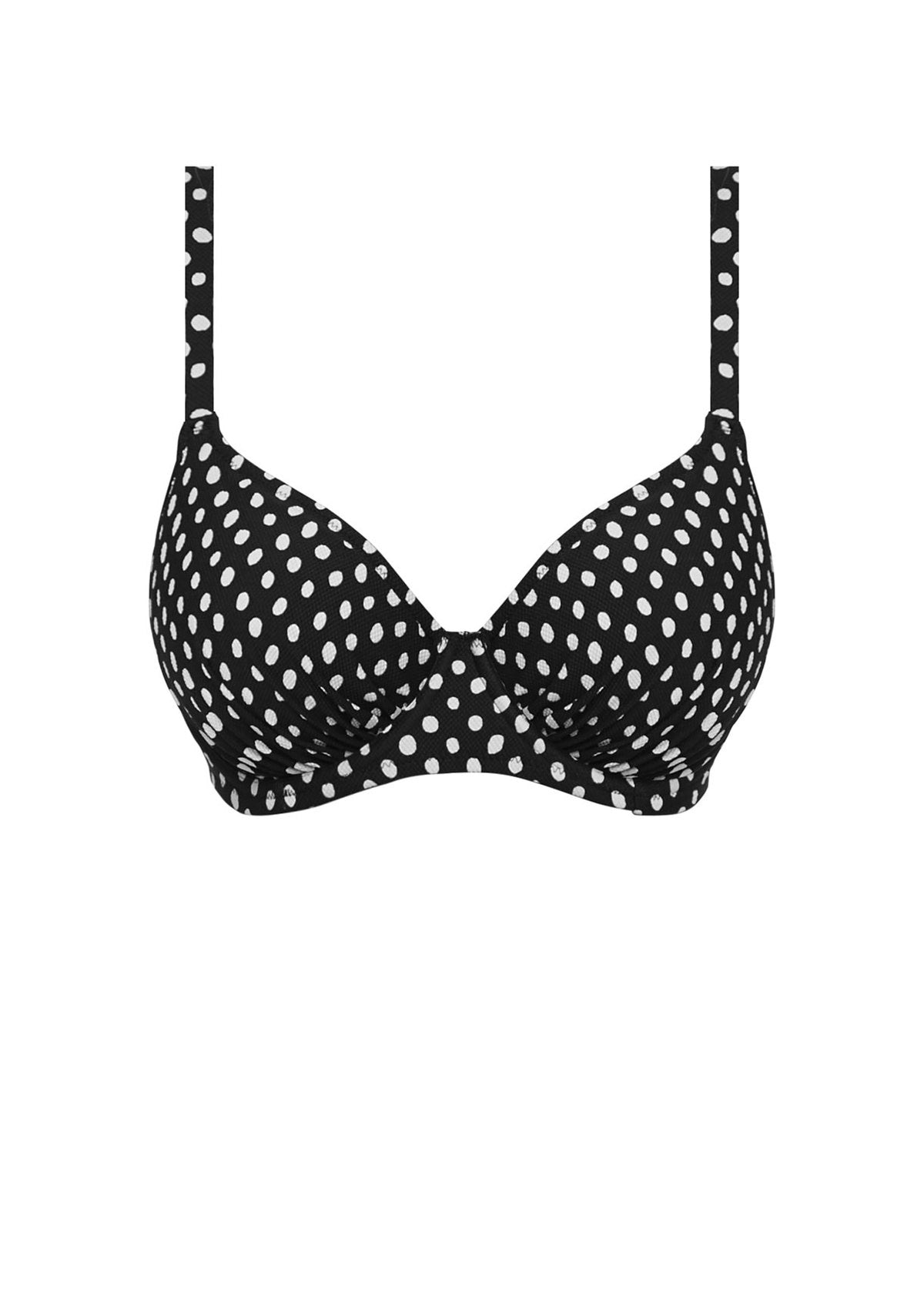 Discover Fantasie's Full Cup Bikini Top from the Santa Monica collection, offering fuller coverage and a gathered cup to flatter all bust shapes. Crafted from soft handle Spanish piqué fabric in a chic, monochromatic spot design, available in cup sizes D - J.