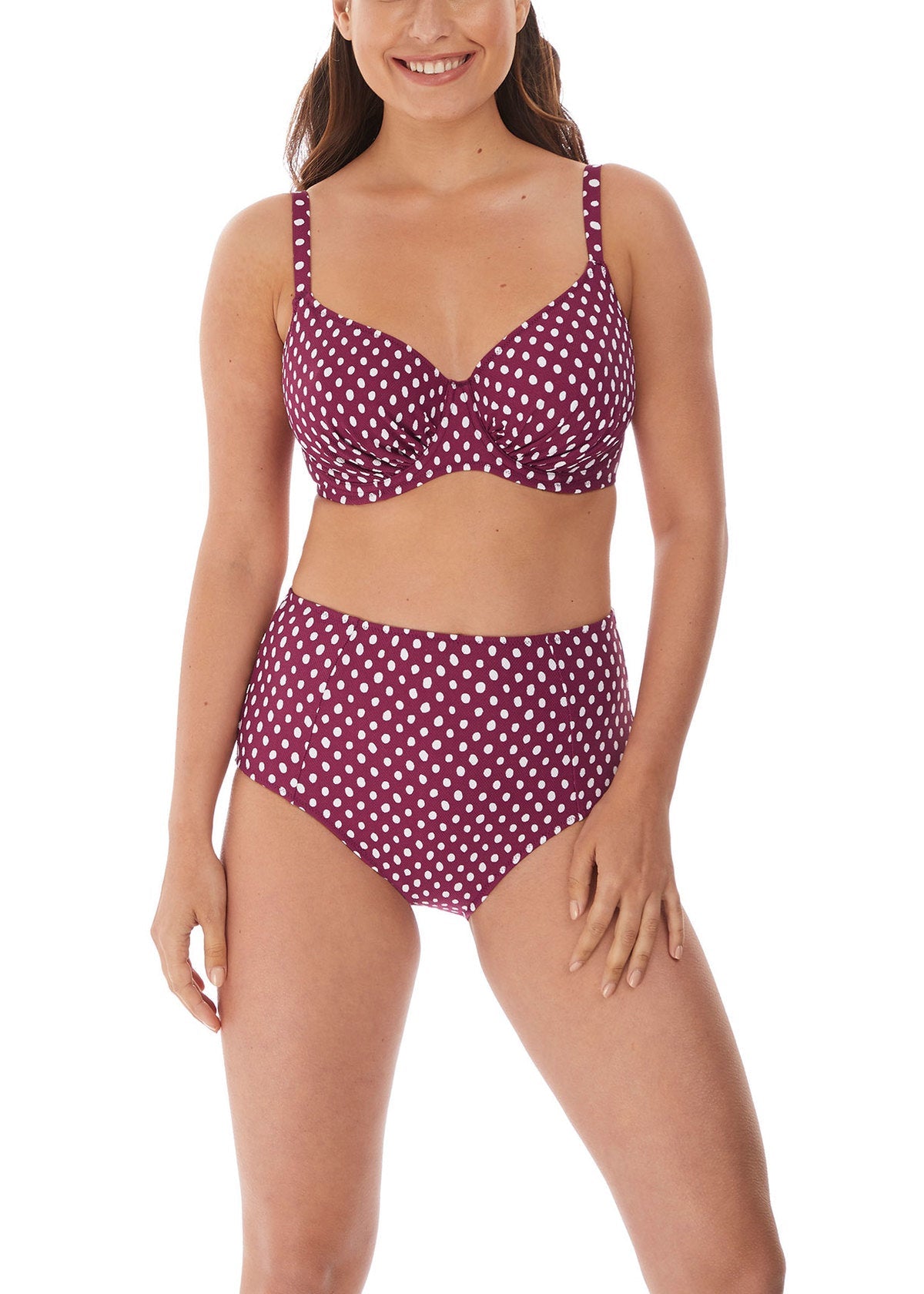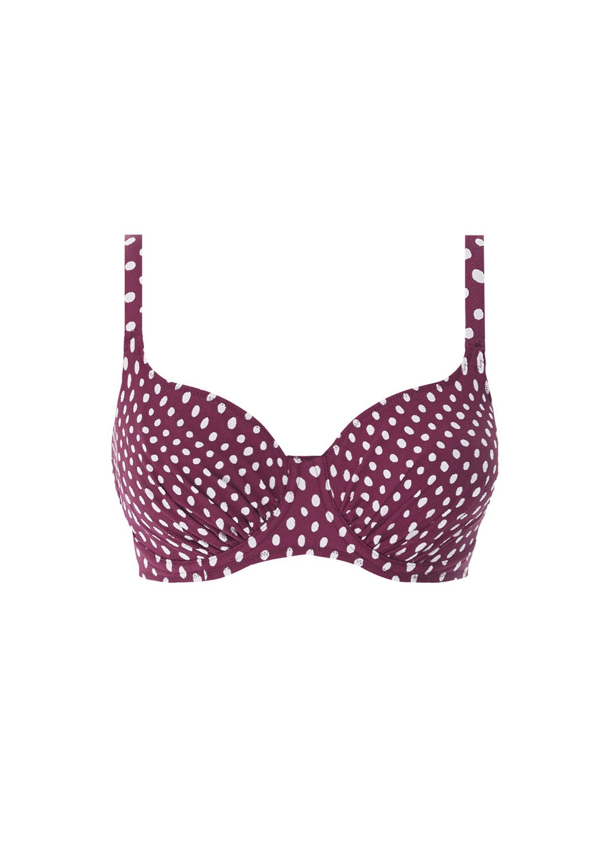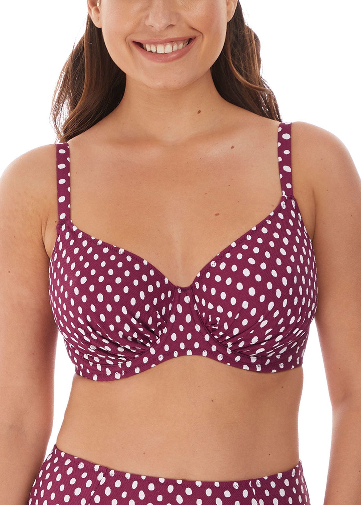 Discover Fantasie's Full Cup Bikini Top from the Santa Monica collection, offering fuller coverage and a gathered cup to flatter all bust shapes. Crafted from soft handle Spanish piqué fabric in a chic, garnet spot design, available in cup sizes D - J.