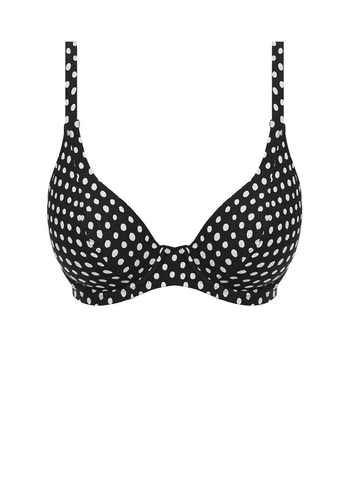 Fantasie's Black and White Santa Monica Plunge Bikini Top features a timeless polkadot design, crafted from soft handle Spanish piqué fabric. A concealed underwire and lined cup offer support, finished with convertible multiway straps.