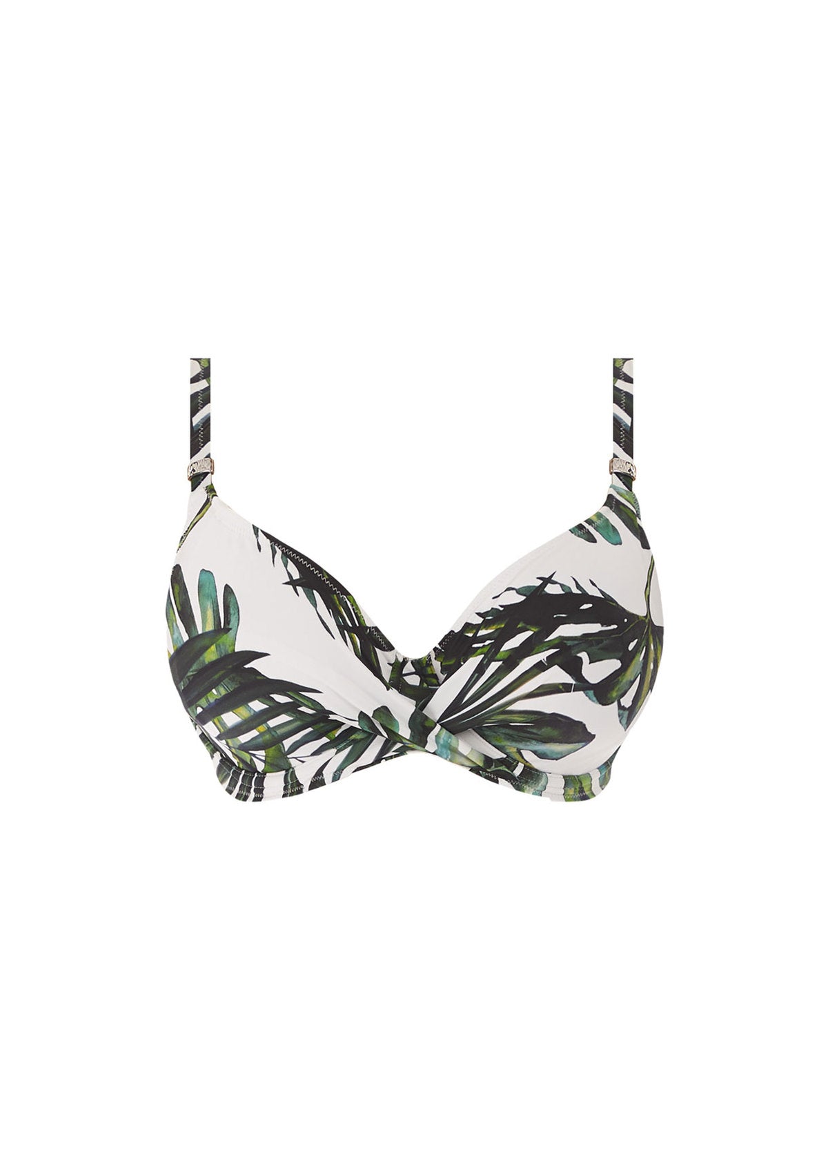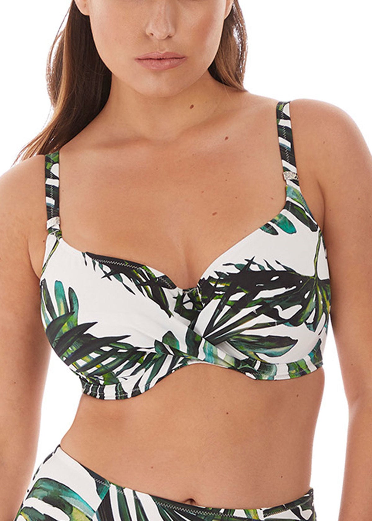 Showcasing an exclusively designed botanical print on a crisp white background, Fantasie's Palm Valley Full Cup Bikini Top in Fern features a flattering wrap over front detail with a concealed side sling for forward projection. Available in cup sizes D - H.