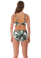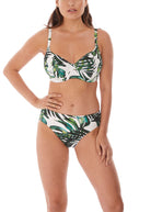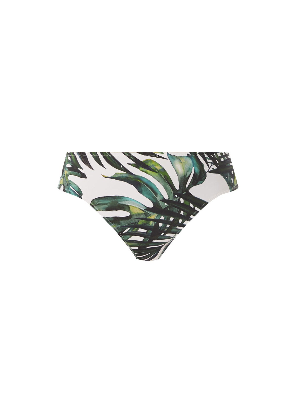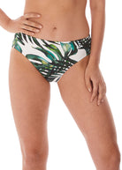 Fantasie's Palm Valley Mid Rise Bikini Brief in Fern showcases an exclusively designed Italian tropical palm print in shades of green on a crisp white base. This fully lined, medium coverage style is available in sizes XS - XXL.