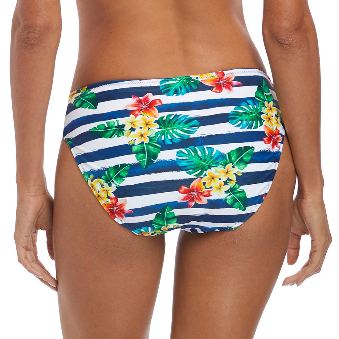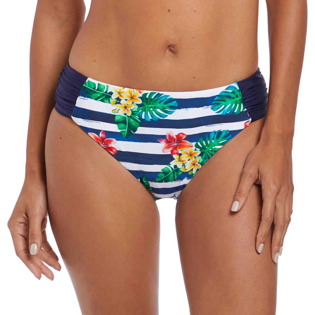 Discover Porto's spirited take on all things nautical with tropical floral details placed on chic navy and white stripes. The Porto Mid Rise Bikini Brief offers offers good coverage with a flattering gathered side.