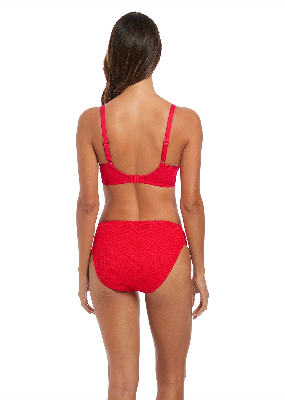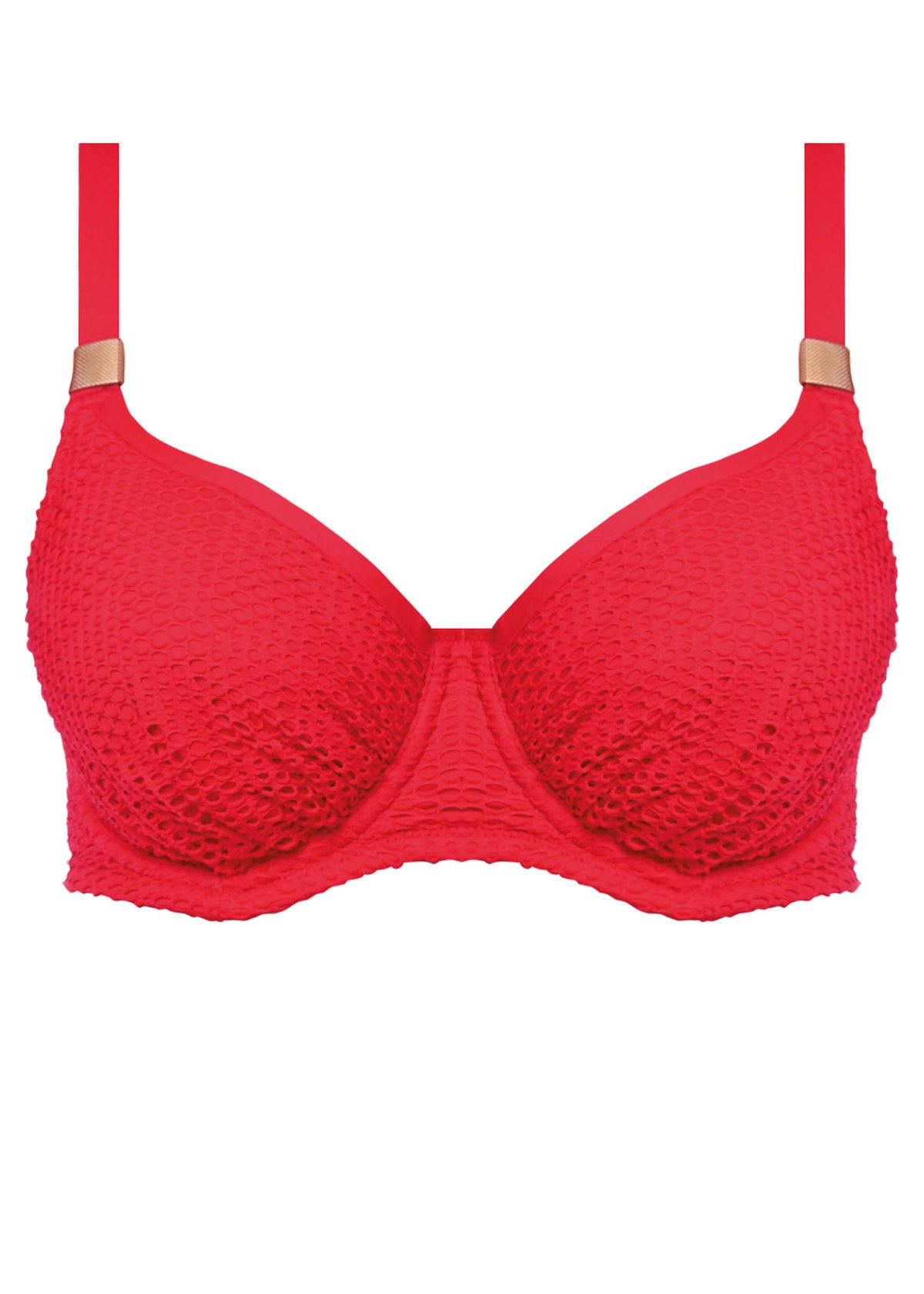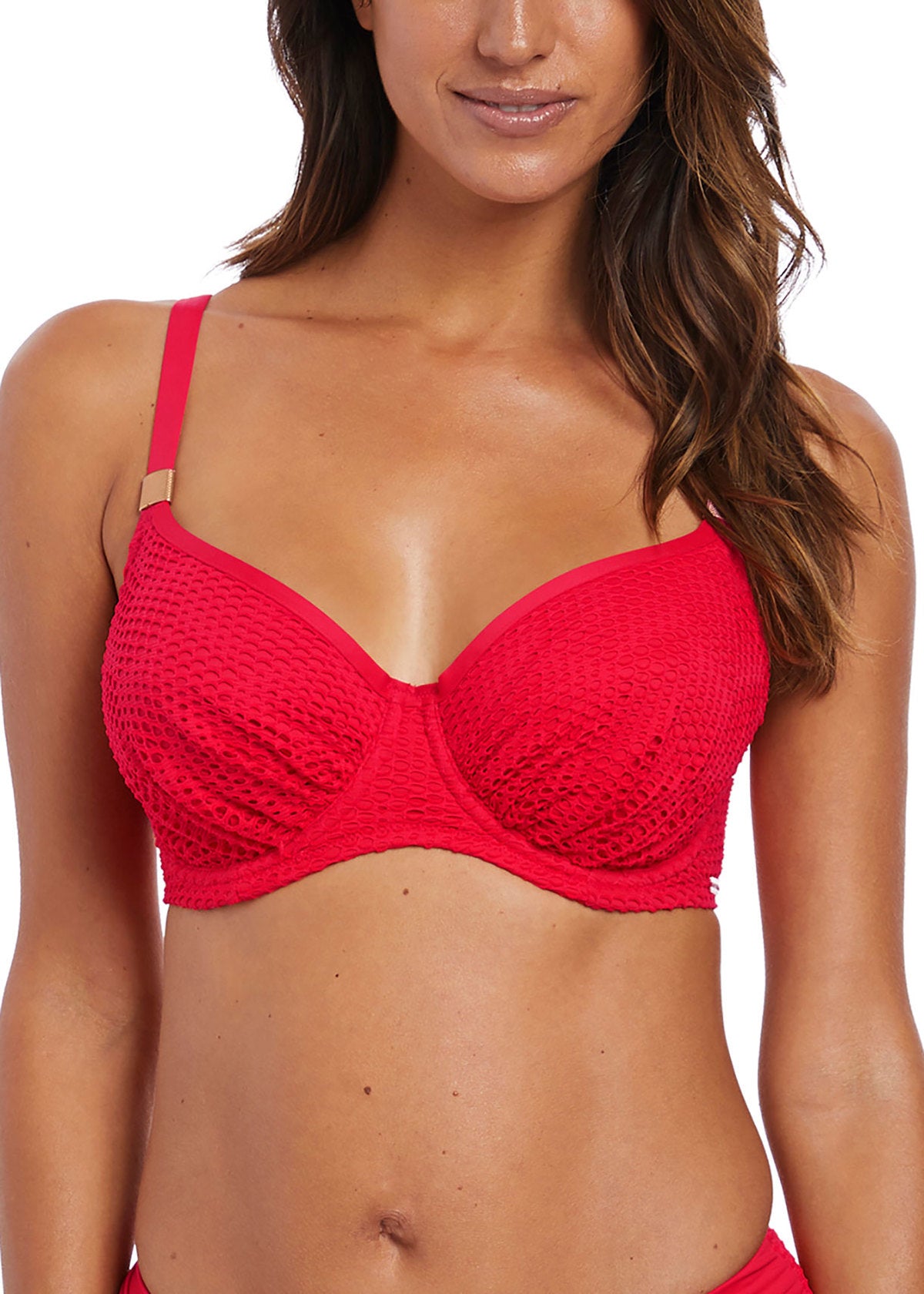 Head to the beach in Fantasie's Marseille Full Cup Bikini Top, designed with gathered cups to flatter all bust shapes. The full coverage style features crochet knit in a Sunset hue, complete with metallic rose gold trims on fixed fully adjustable shoulder straps.