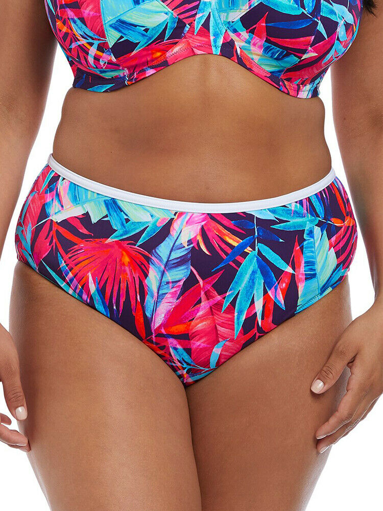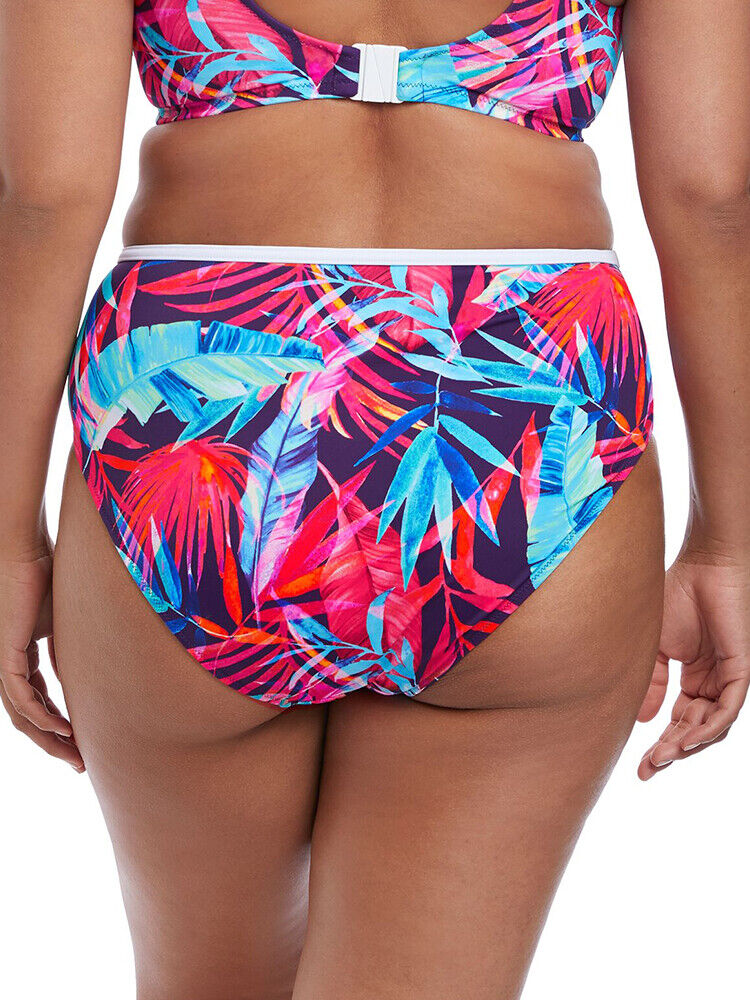 Elomi Paradise Palm High Rise Bikini Bottoms. These stunning bikini briefs will make you stand out from the crowd this season. The white elasticated binding giving a sporty look. This lightweight printed fabric with Xtra Life LYCRA is fully lined in a contrasting colour for additional comfort.