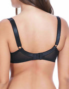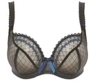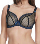 The Freya Pulse Underwire Plunge Balcony Bra in Black is a sexy semi sheer bra which has diamond shape detailing on the cups and been beautifully highlighted in contrasting blue double scalloped trim and an embroidered pattern along the edge of the cup. This bra has been finished with an oversized bow on the centre of the cups and bows on the straps.