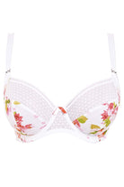 This non padded side support bra features a floral design that rests on a crisp white base. A modern geometric net for a clean and fresh look a super soft handle fabric for a comfortable feel with a semi sheer top cup for a beautifully feminine look.