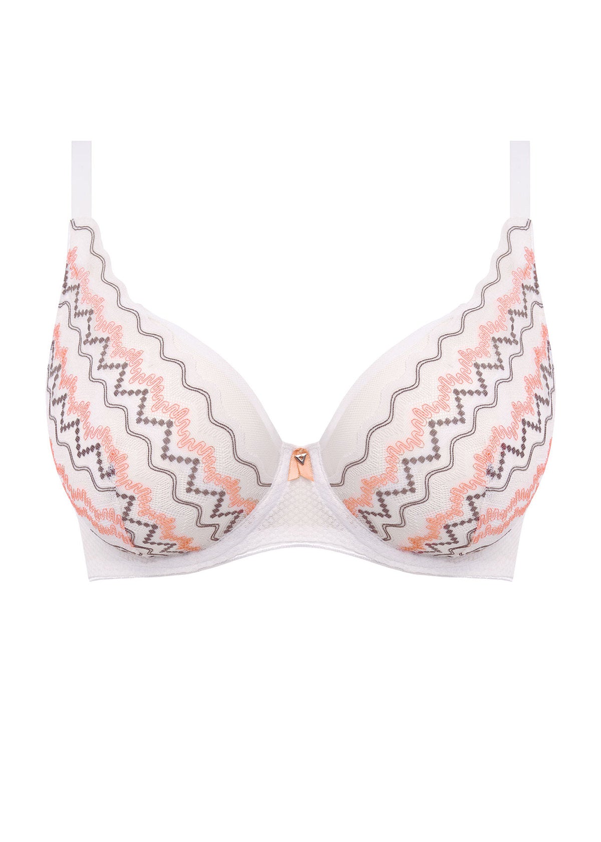 Inspired by the much-loved boho trend, Freya's Festival Vibe High Apex Bra in White Coral makes a statement, designed with semi-sheer net top cups, alongside geometric mesh and three tone lace for a contemporary look. The classic high apex shape offers a flattering low cut and plunging neckline without loss of support, finished with pretty ribbon and triangular metallic details