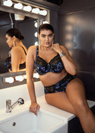 Twilight features a photographic print. Opulent in its design, blue anemone flowers are scattered across a black ground, with lace accents adorning all styles. The UW Banded Bra provides all day comfort and support, with its three section cup that features a powerful stretch lace and elasticated neck edge for ease of fit