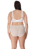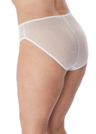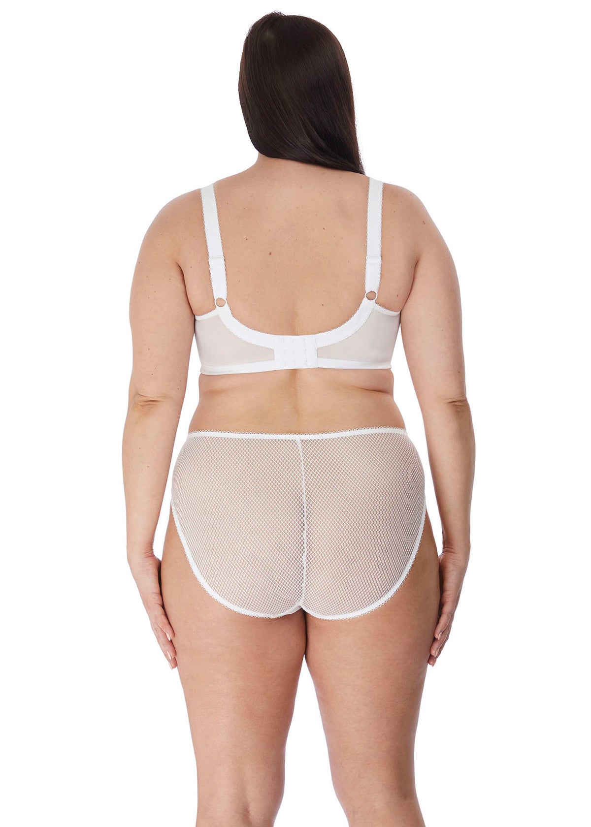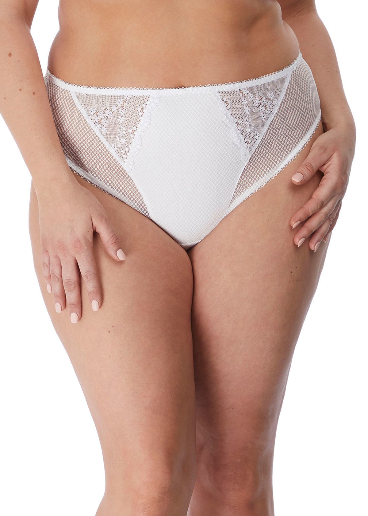Complete the Charley collection with the High Leg Brief in White colourway, designed with lace side panels and a sheer mesh back. The pretty style sits at the waist with a high cut leg shape.